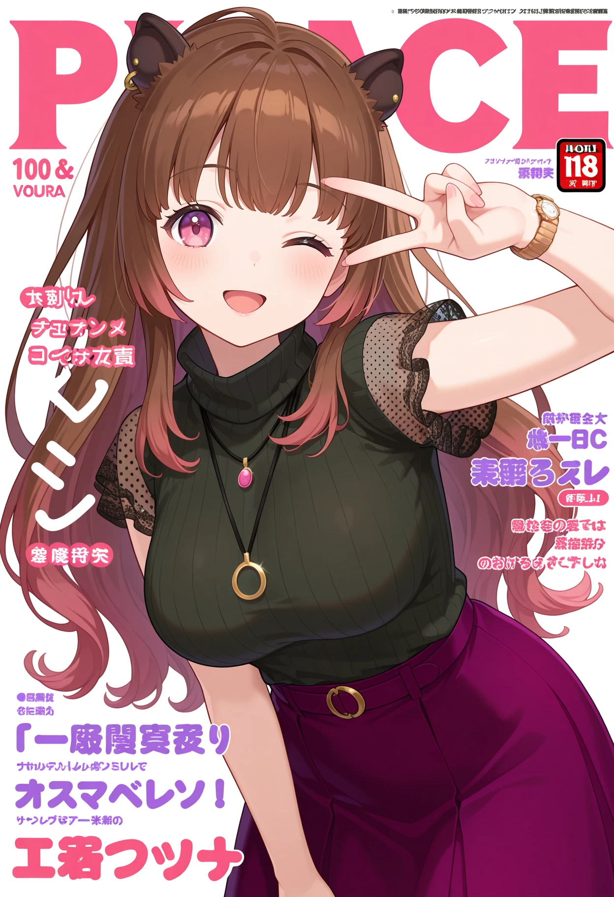 ddizumi, long hair, brown hair, animal ears, pink eyes, necklace, turtleneck sweater, black sweater, short sleeves, see-through sleeves, wristwatch, purple skirt
