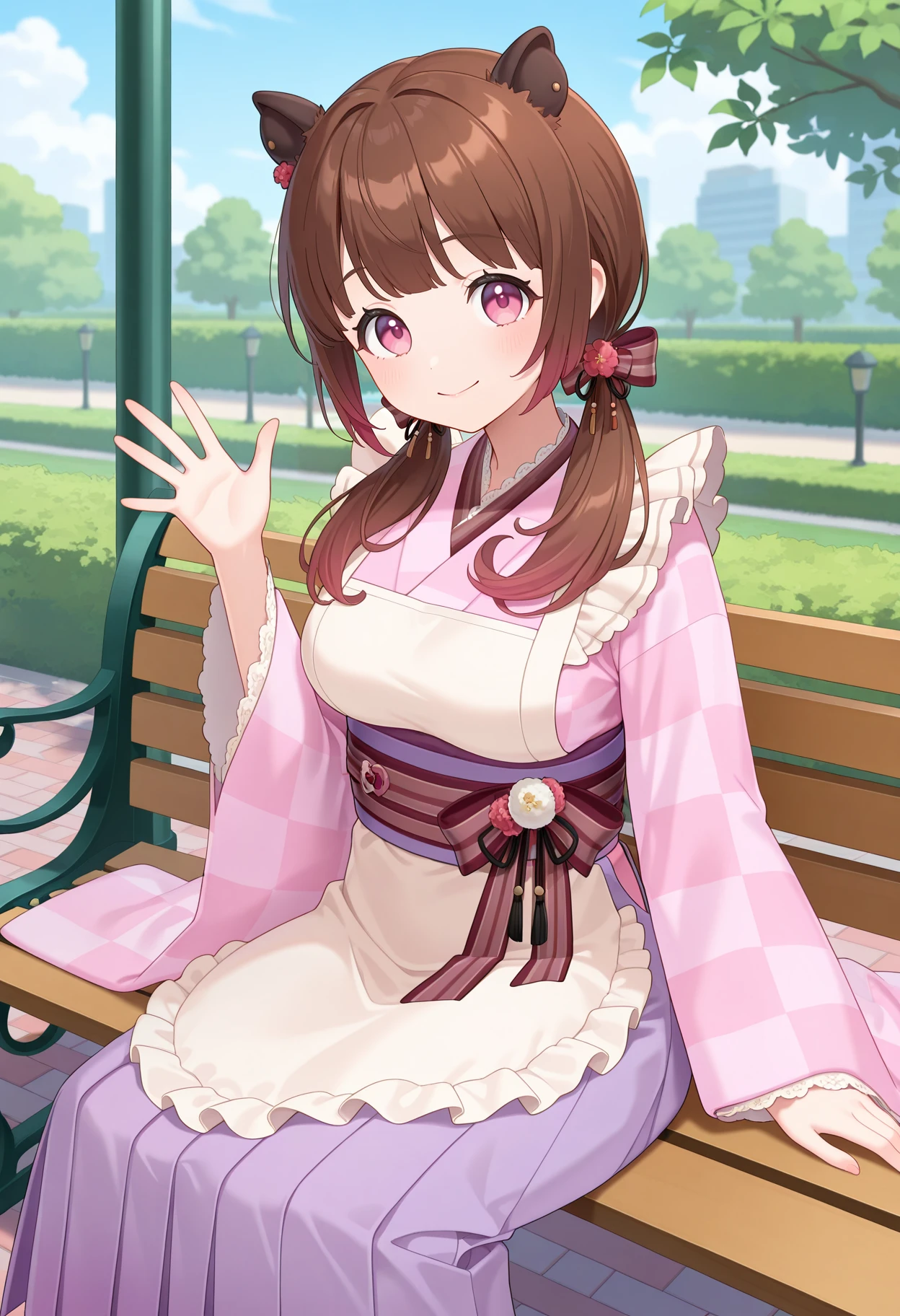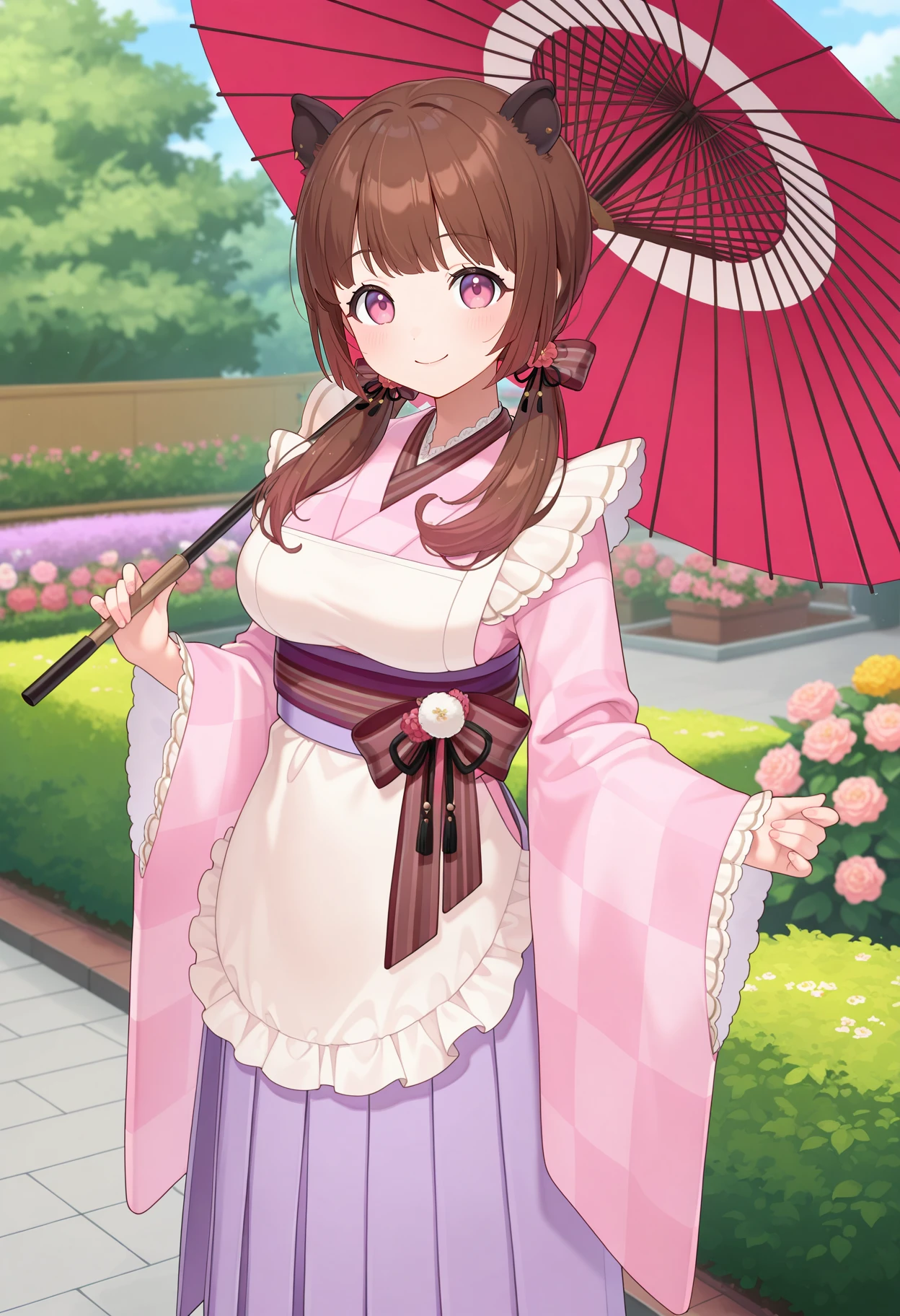 ccizumi, long hair, brown hair, low twintails, animal ears, hair bow, pink eyes, pink kimono, long sleeves, wide sleeves, obi, striped bow, white apron, light purple hakama, black pantyhose