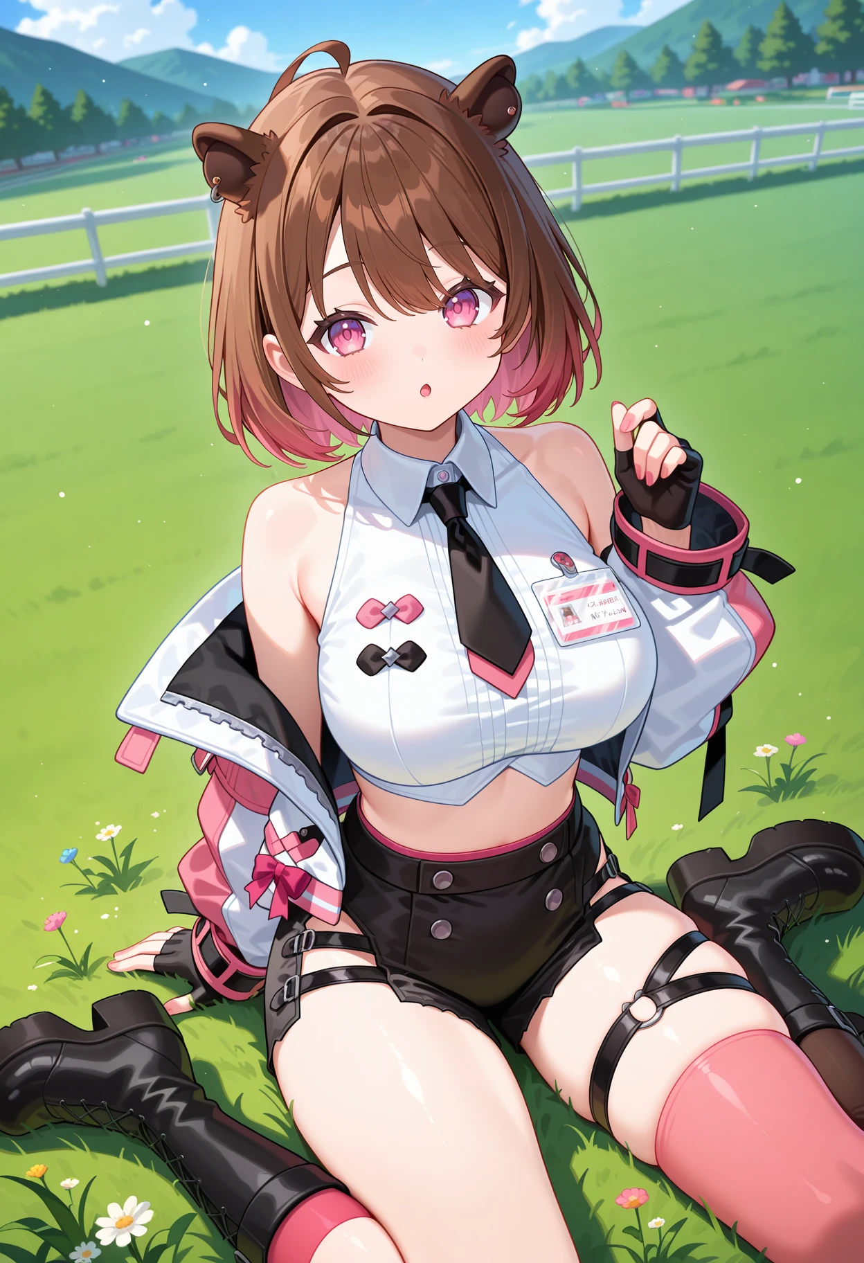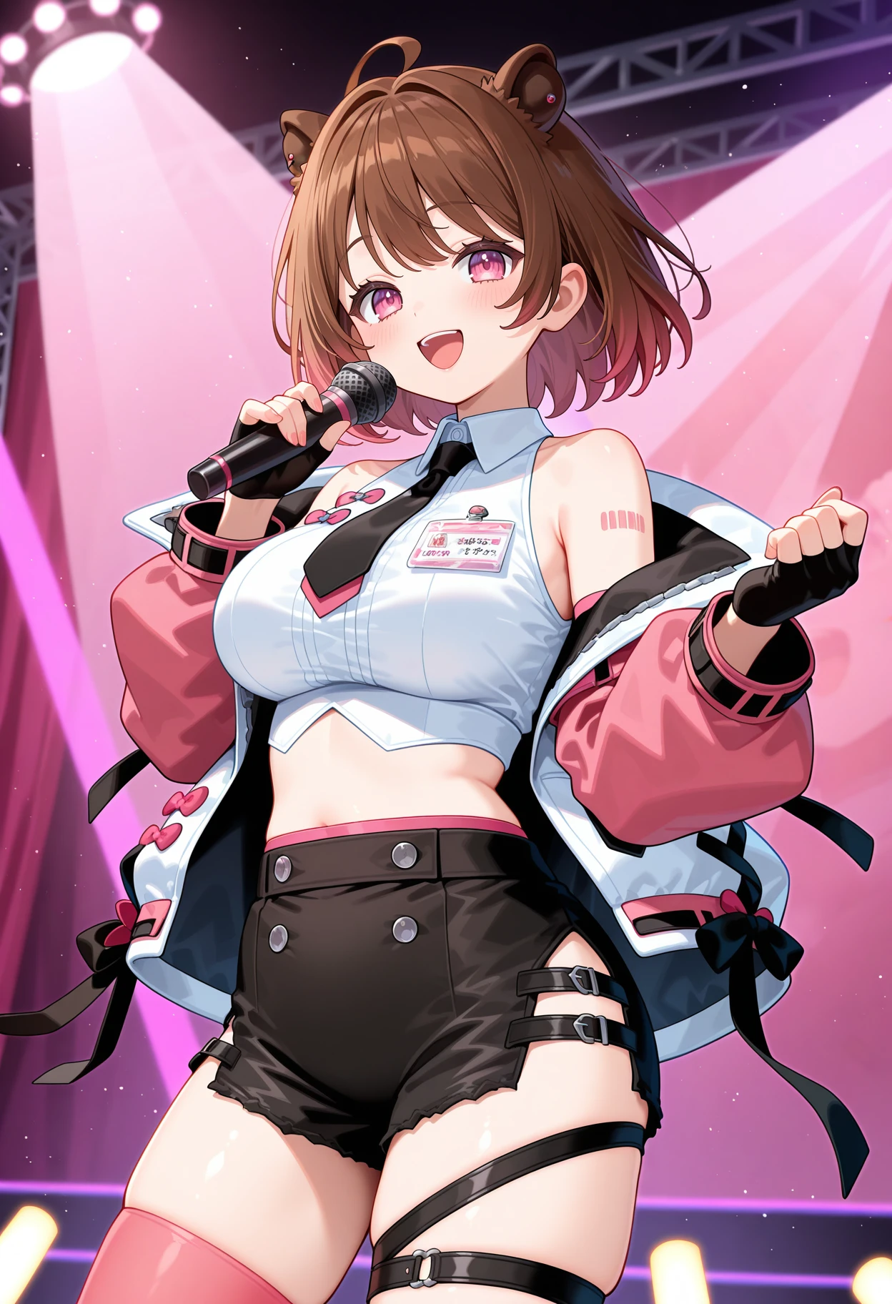 aaizumi, short hair, brown hair, ahoge, animal ears, pink eyes, black necktie, crop top, sleeveless shirt, white shoulder, jacket, long sleeves, fingerless gloves, black gloves, black shorts, thigh strap, single thighhigh, pink thighhighs