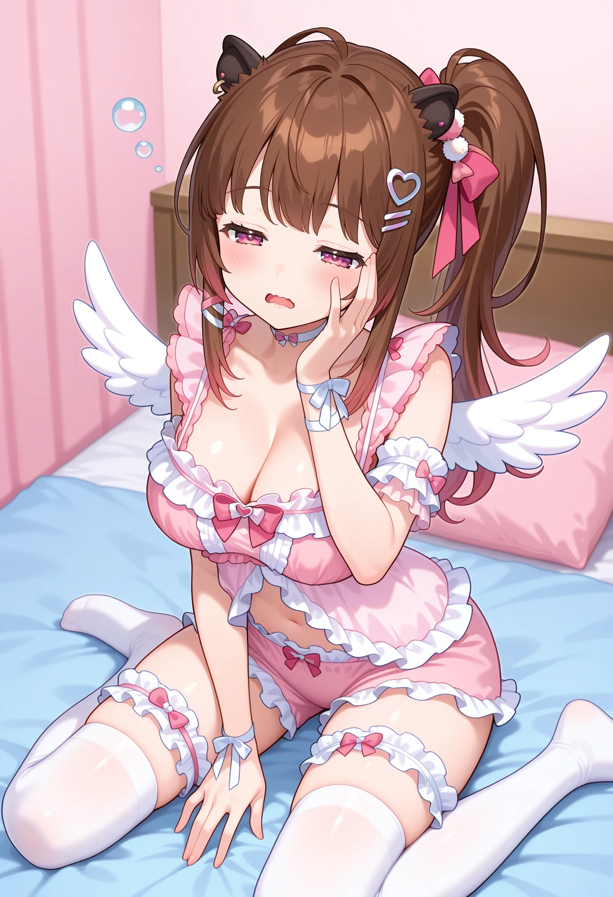 eeizumi, long hair, brown hair, side ponytail, animal ears, hair bow, hair ornament, pink eyes, wings, white choker, cleavage, pajamas, pink bow, frills, pink negligee, wrist bow, midriff, pink shorts, bridal garter, white thighhighs