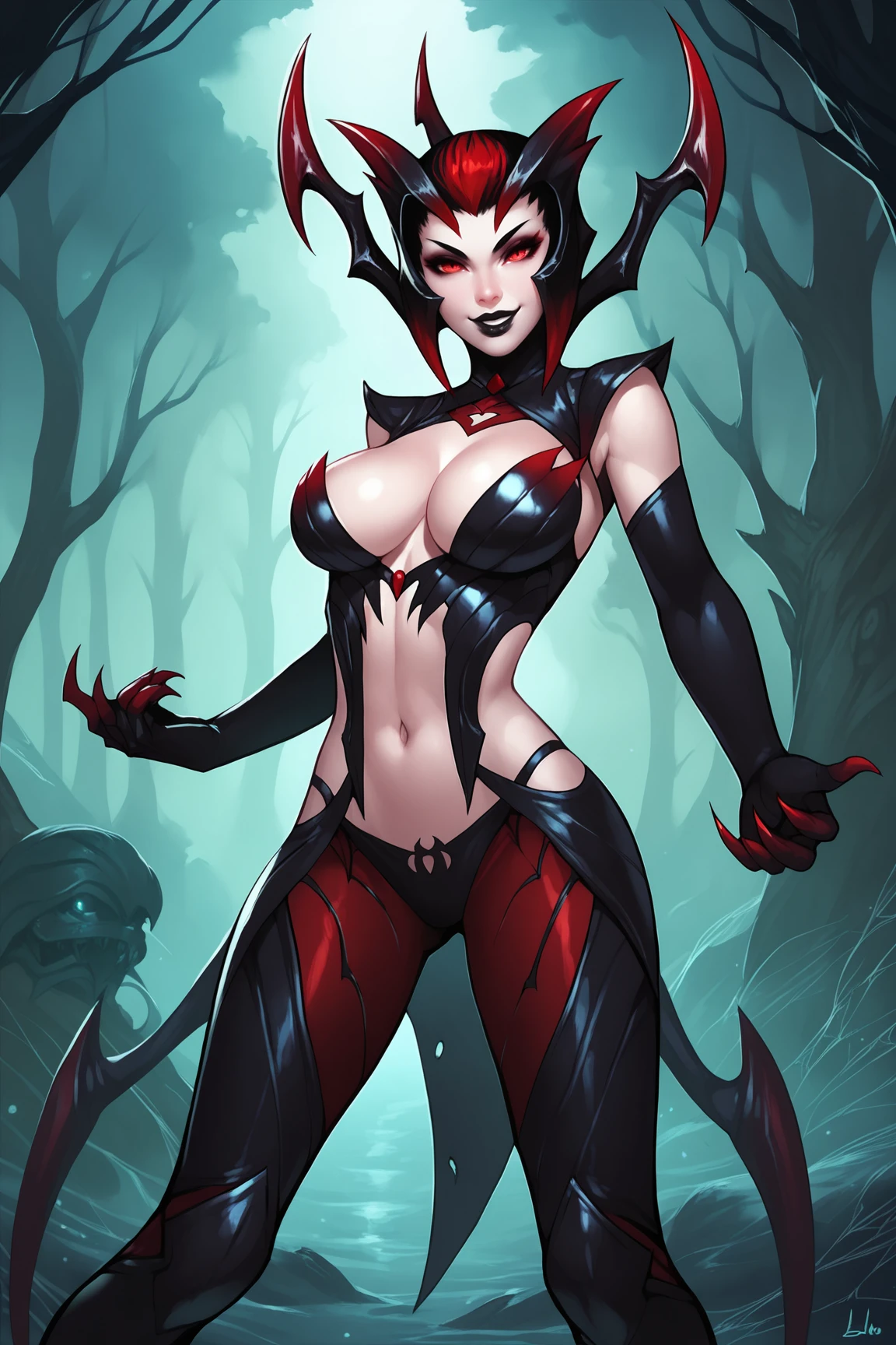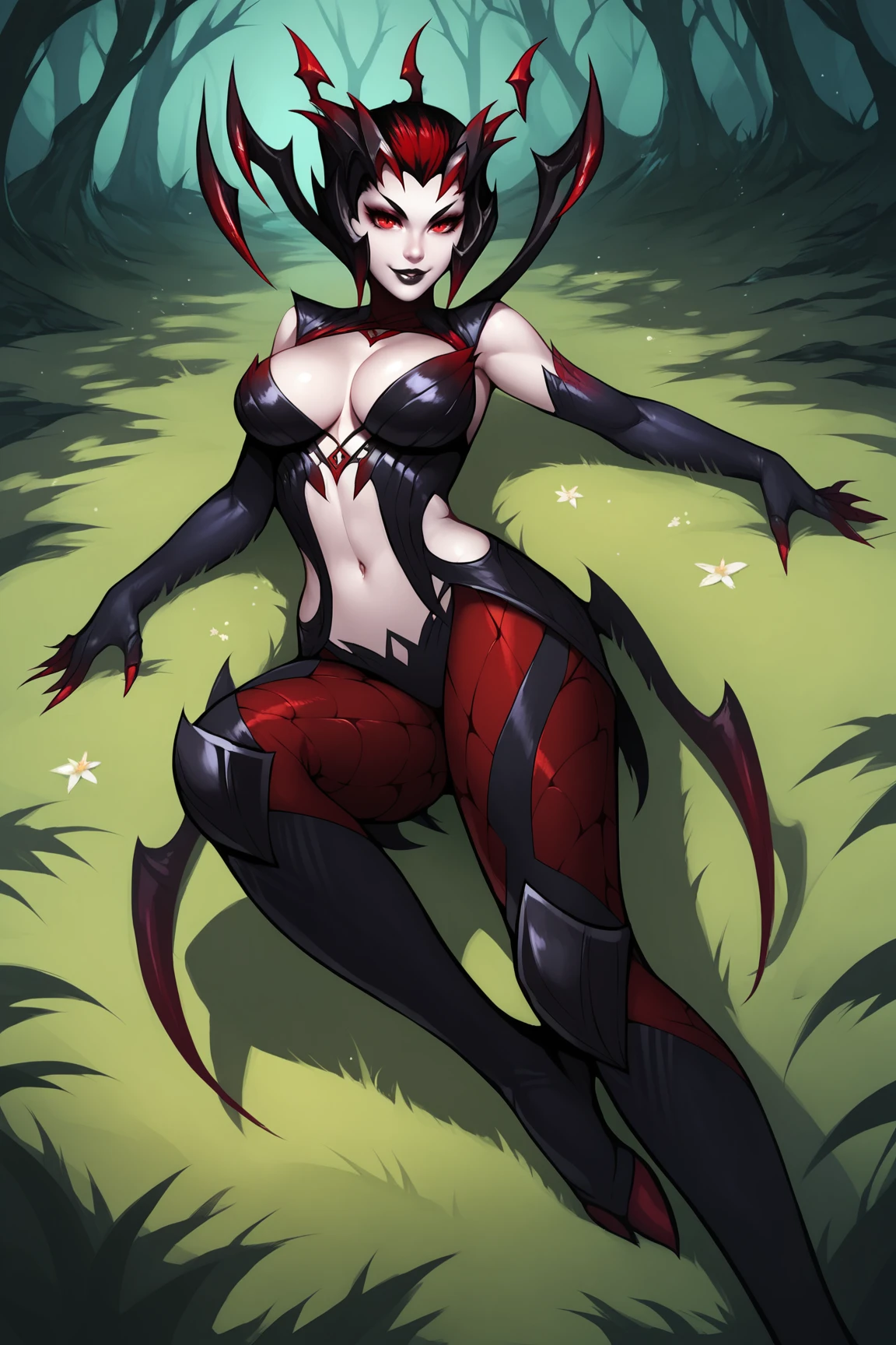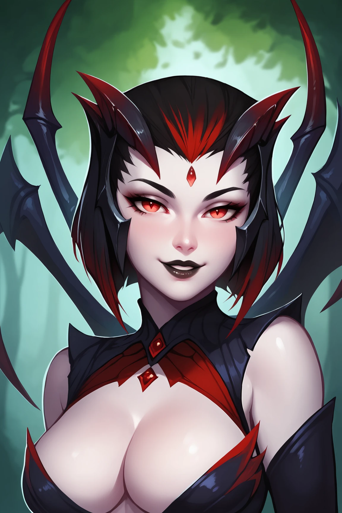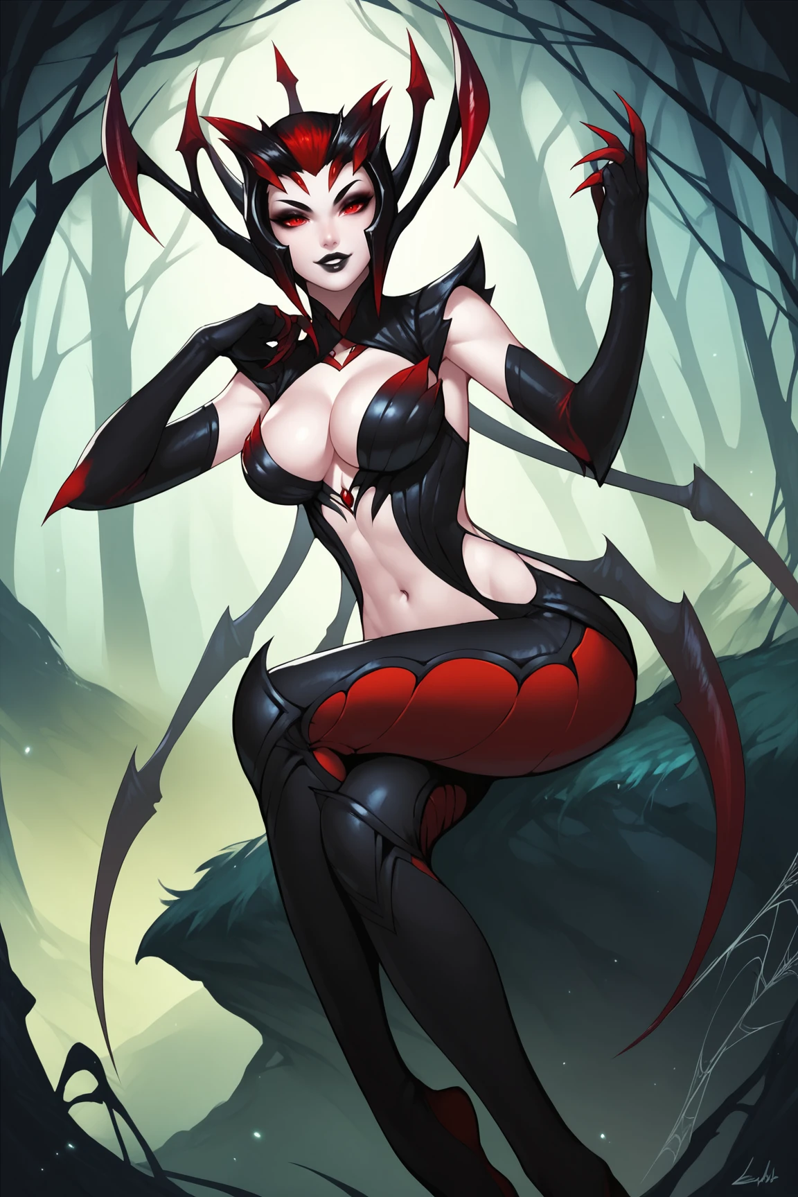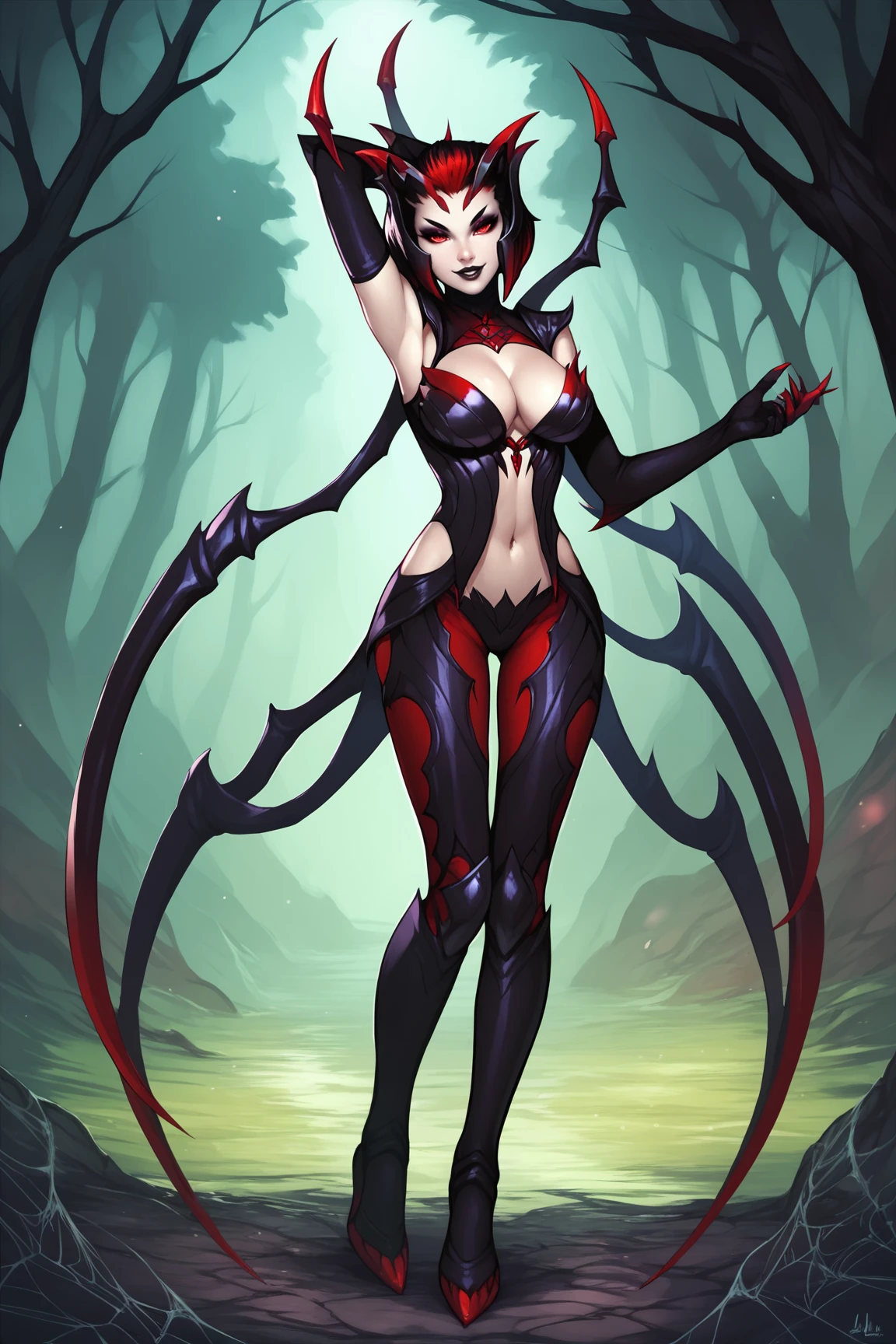 EliseLoLXL, black lips, makeup, red eyes, black hair, two-tone hair, short hair, helmet, horns, white skin, colored skin, large breasts, (arachne), wings with spider legs, cleavage, bodysuit, elbow gloves, red claws, navel, twighhighs