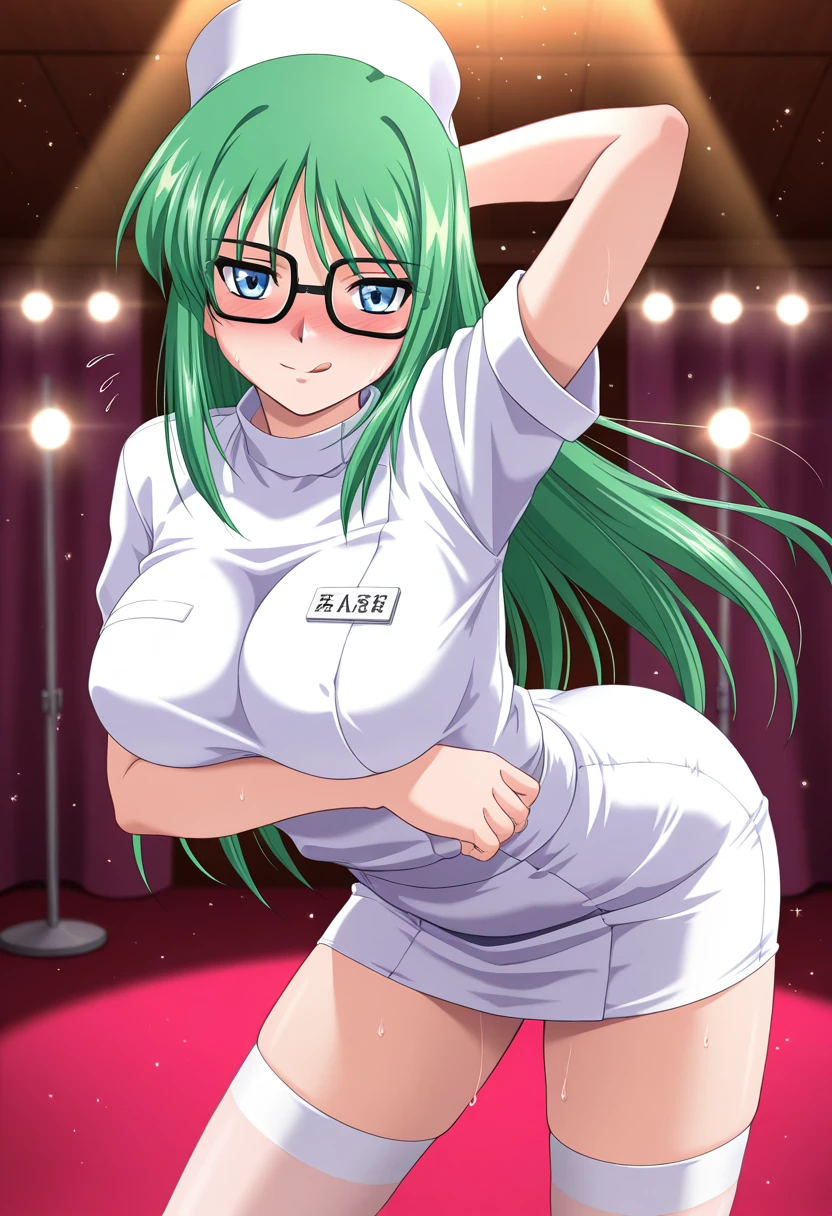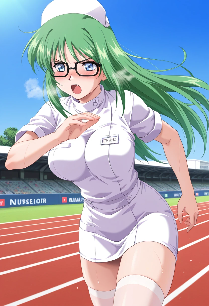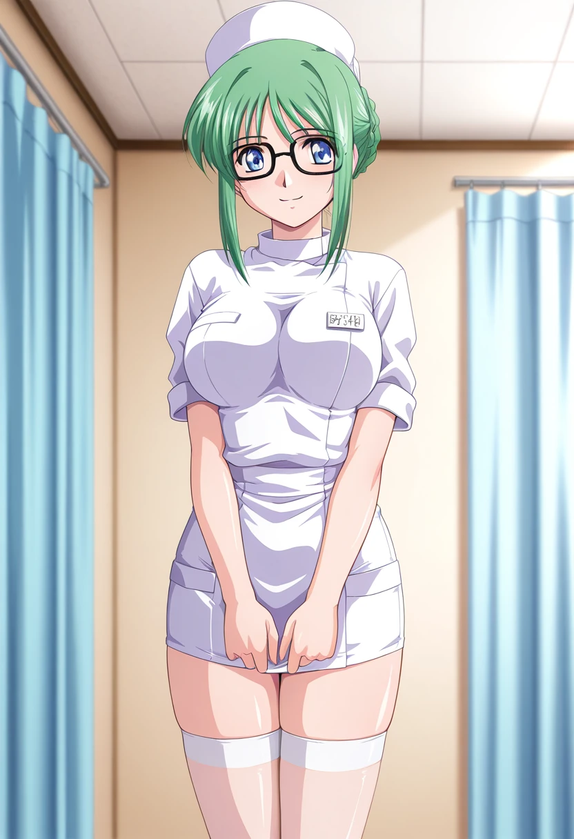 satsukiww, blue eyes, glasses, green hair, long hair, hair down, sidelocks, large breasts,
