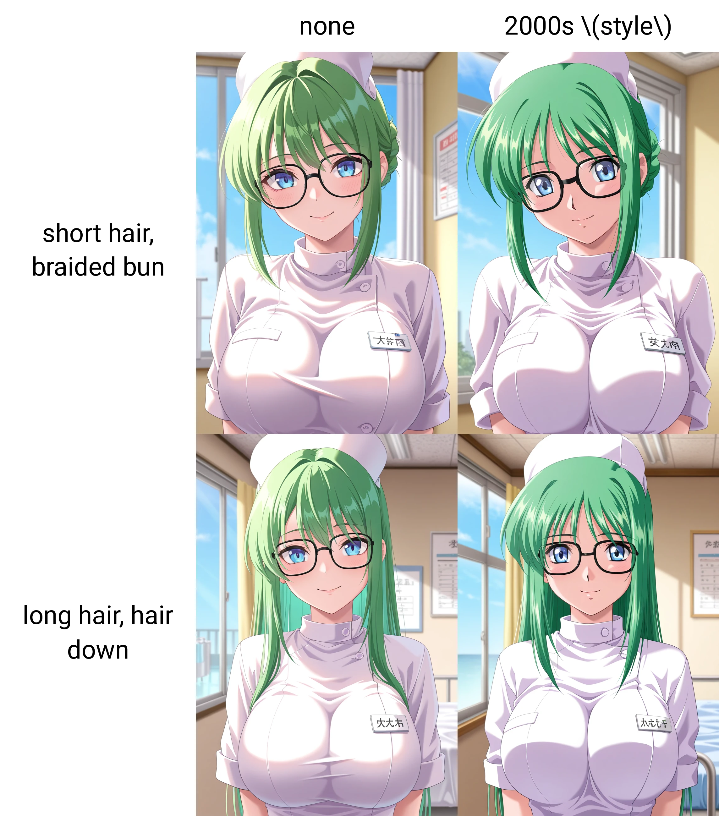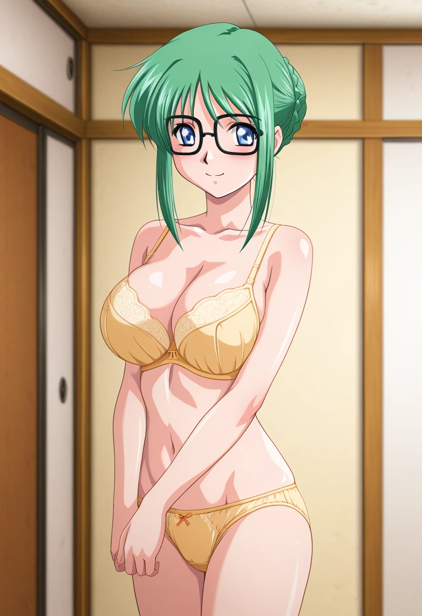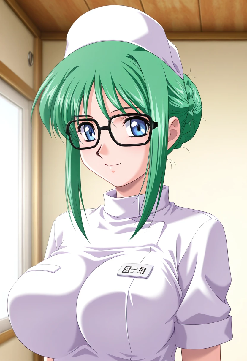 satsukiww, blue eyes, glasses, green hair, short hair, braided bun, sidelocks, large breasts,