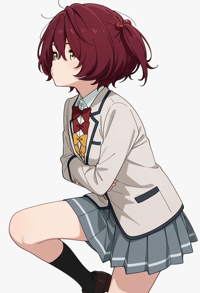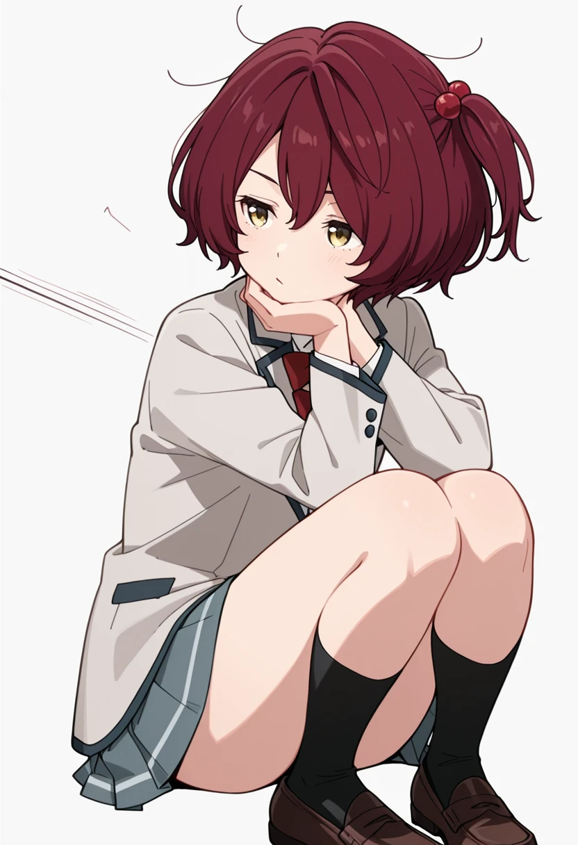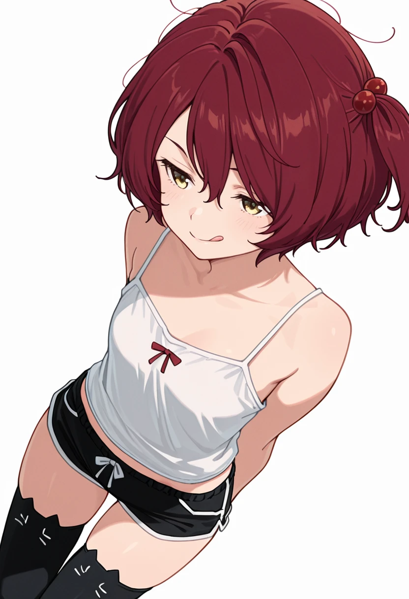 komari_cnr,1girl, short hair, red hair, yellow eyes, hair bobbles, one side up,messy hair,👗Default Outfit