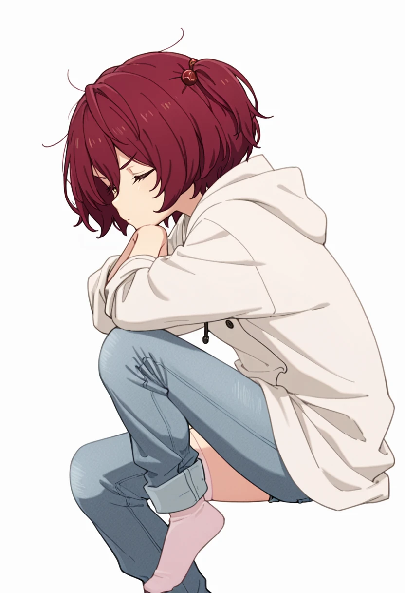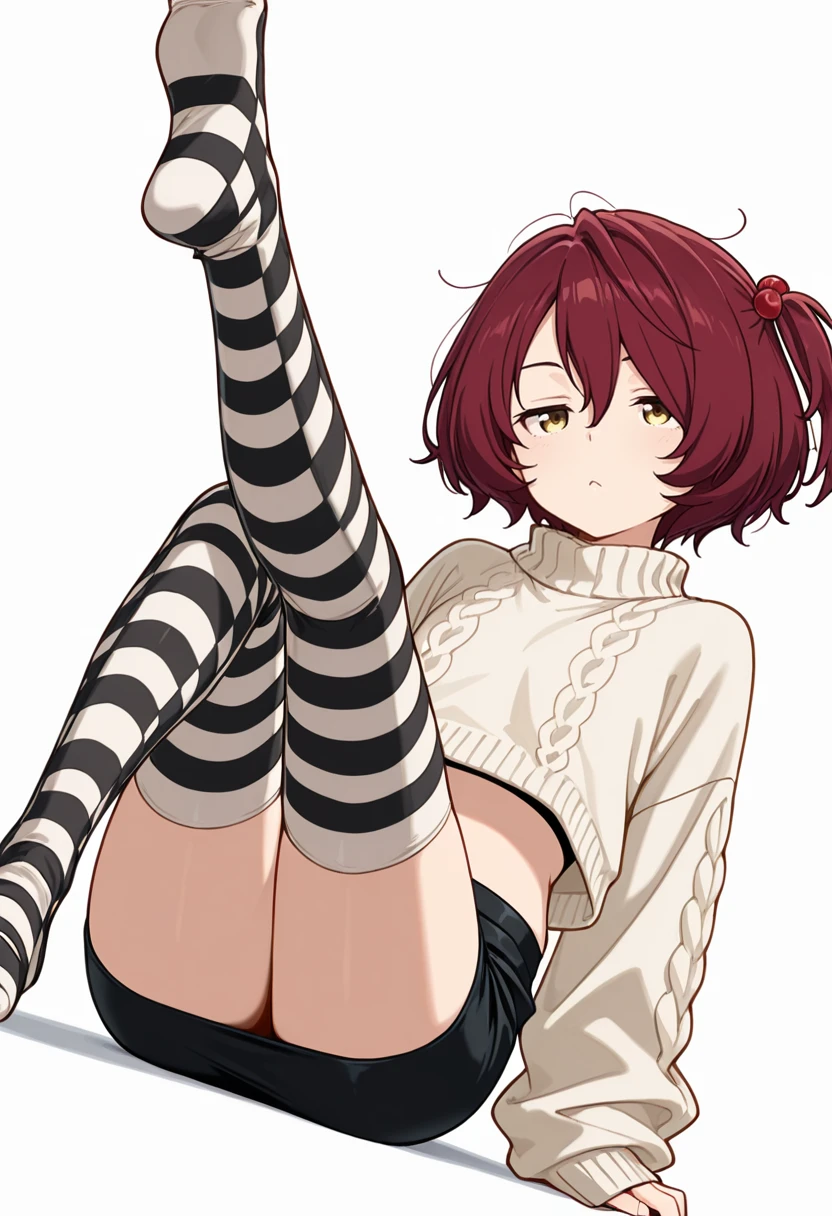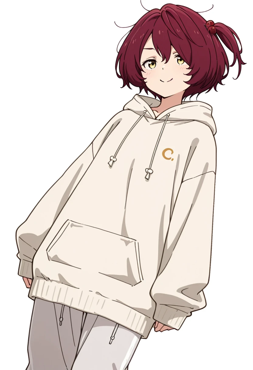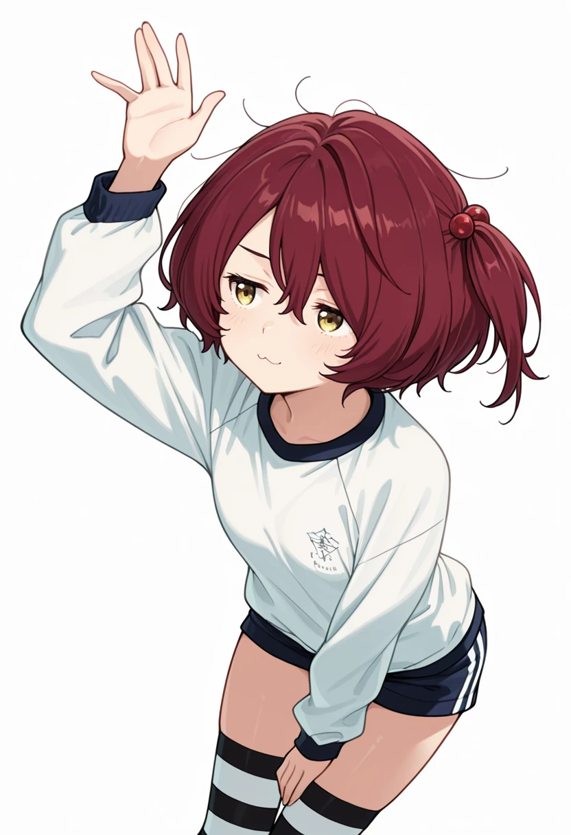komari_cnr,1girl, short hair, red hair, yellow eyes, hair bobbles, one side up,messy hair,👗Default Outfit