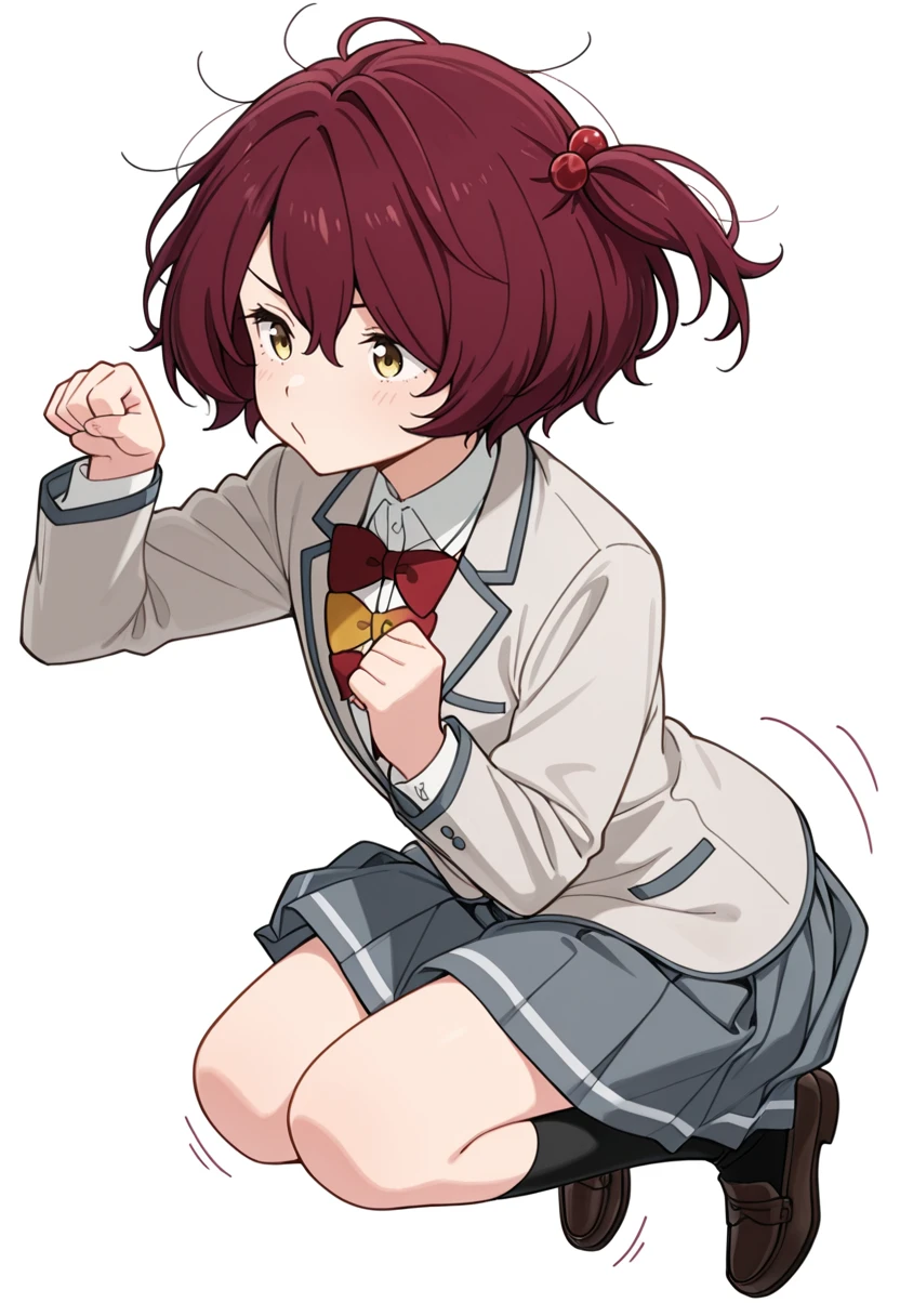 komari_s1, pleated skirt, grey skirt, white shirt,bowtie, red bowtie,grey jacket,black socks, loafers, Explanation and notes below👇
