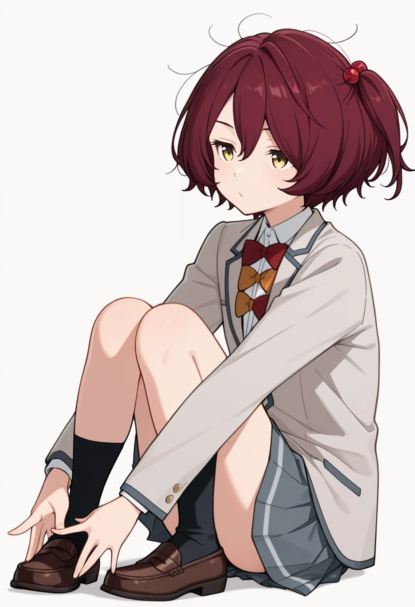 komari_s1, pleated skirt, grey skirt, white shirt,bowtie, red bowtie,grey jacket,black socks, loafers, Details