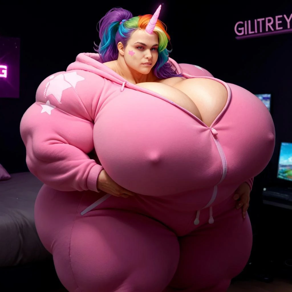 1girl, glittery multicolored hair, petite, pink eyes, right-side pink star face stickers, short stature, pink unicorn onesie, rainbow clouds, light purple horn, glittery multicolored mane, short multicolored onesie tail