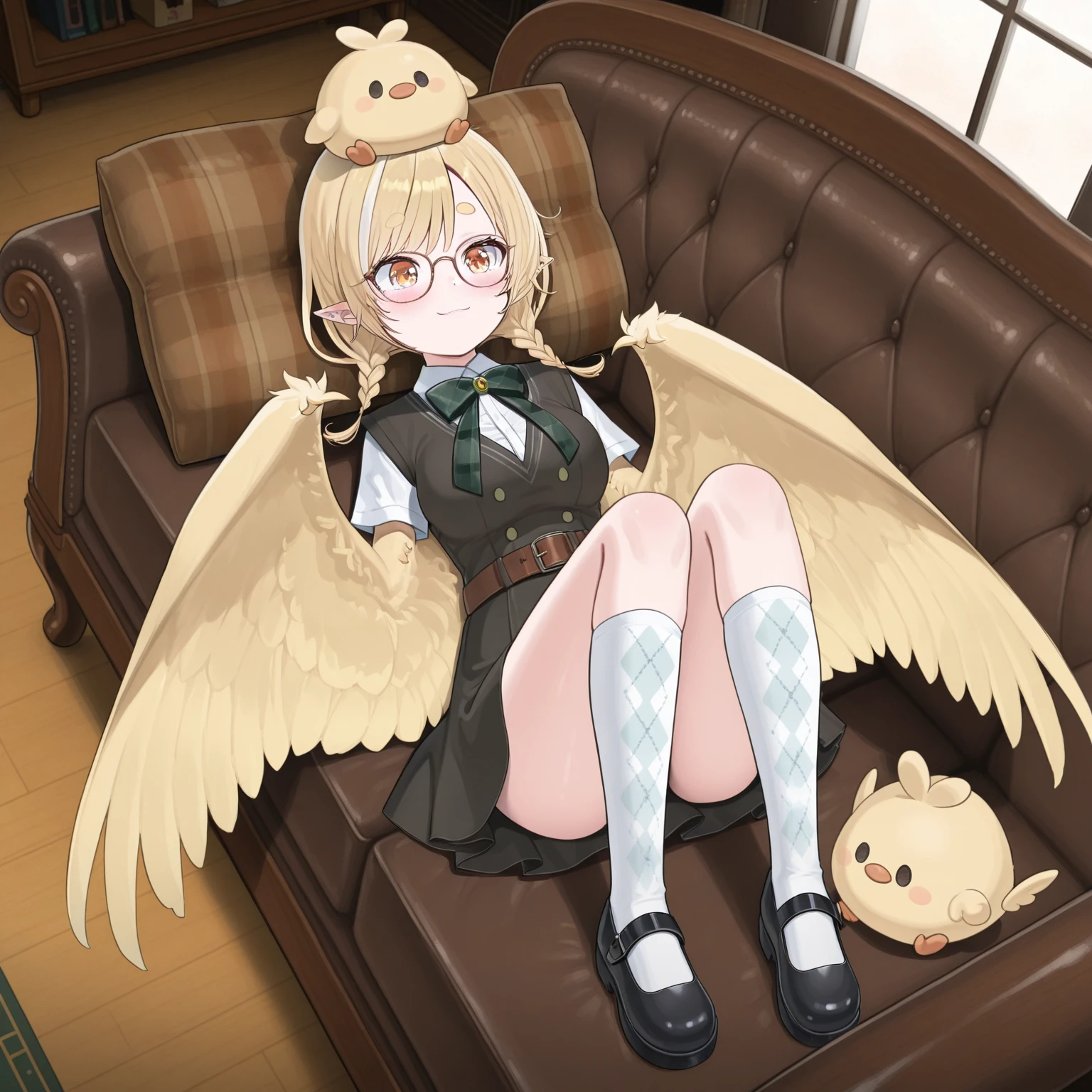 kanna_yanagi, large breasts, pointy ears, streaked hair, twin braids, glasses, winged arms, vest, white undershirt, skirt, belt, white socks, argyle kneehigh socks, mary janes,