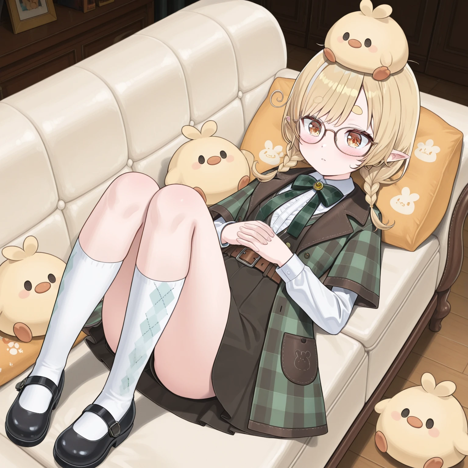 kanna_yanagi, pointy ears, twin braids, glasses, plaid headwear, beret, short-sleeved coat, plaid coat, white undershirt, long-sleeved undershirt, skirt, belt, white socks, argyle kneehigh socks, mary janes,