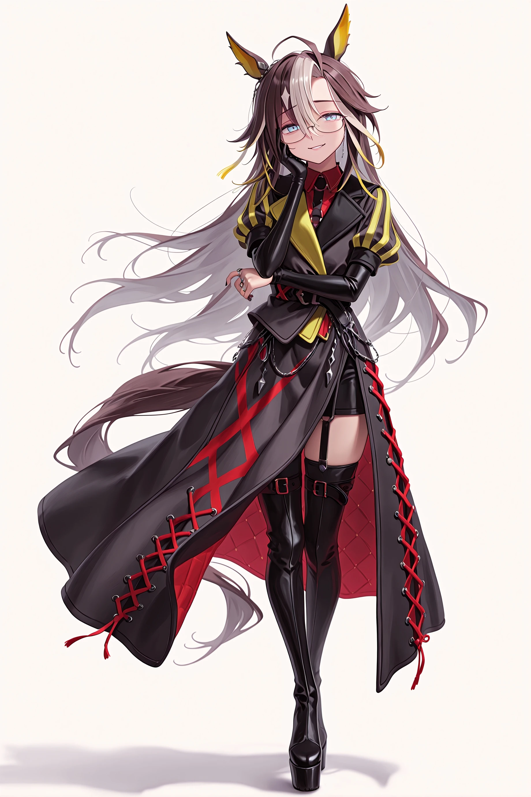 dream journey \(umamusume\), glasses, eyewear strap, horse girl, horse tail, black coat, cross-laced clothes, red shirt, long sleeves, single glove, thigh boots, red nails, small breasts,