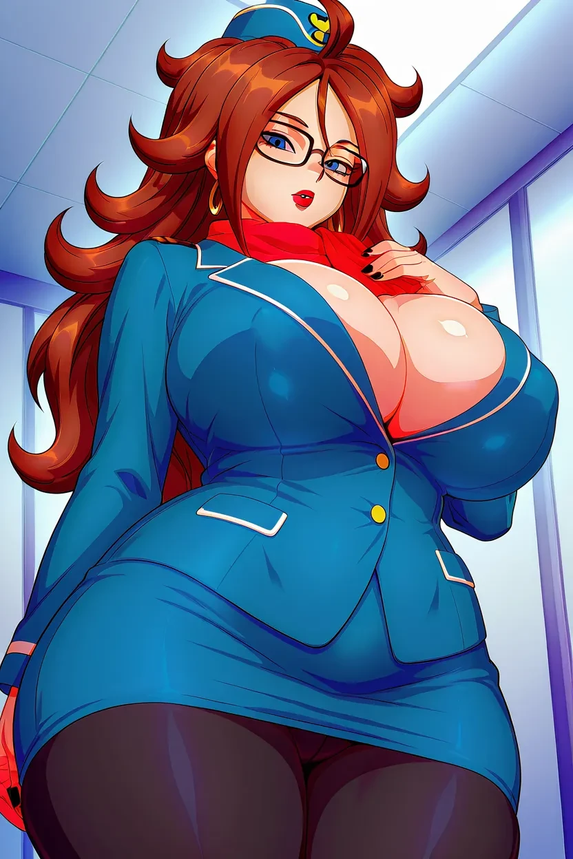 1girl, Android 21, blue_eyes, glasses, brown_hair, glossy_lips, massive_breasts, curvy, sexy, wide hips, thick thighs, , fully , , , DBZ_art_style, HD, Hi-res, excellent quality, anime_coloring