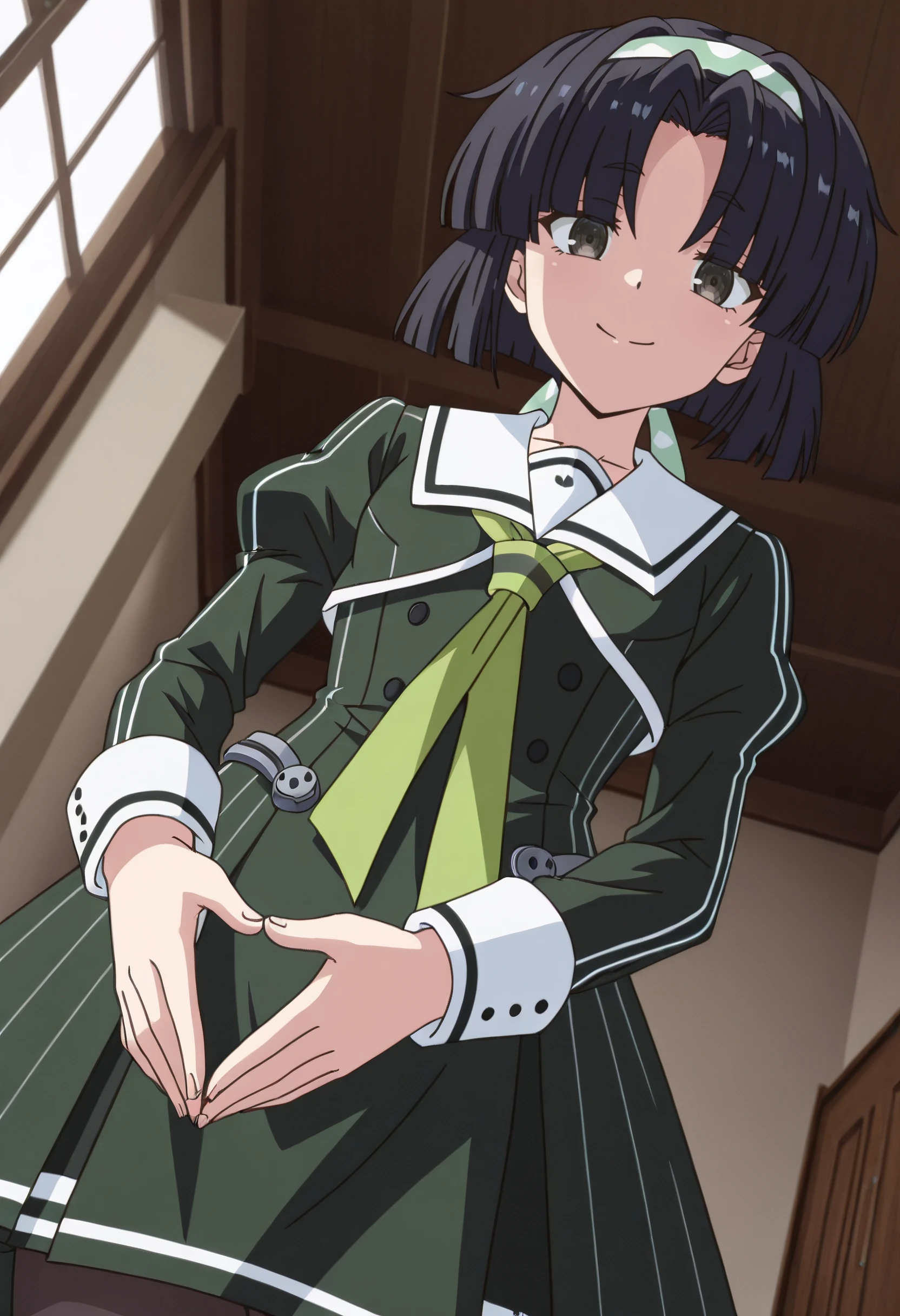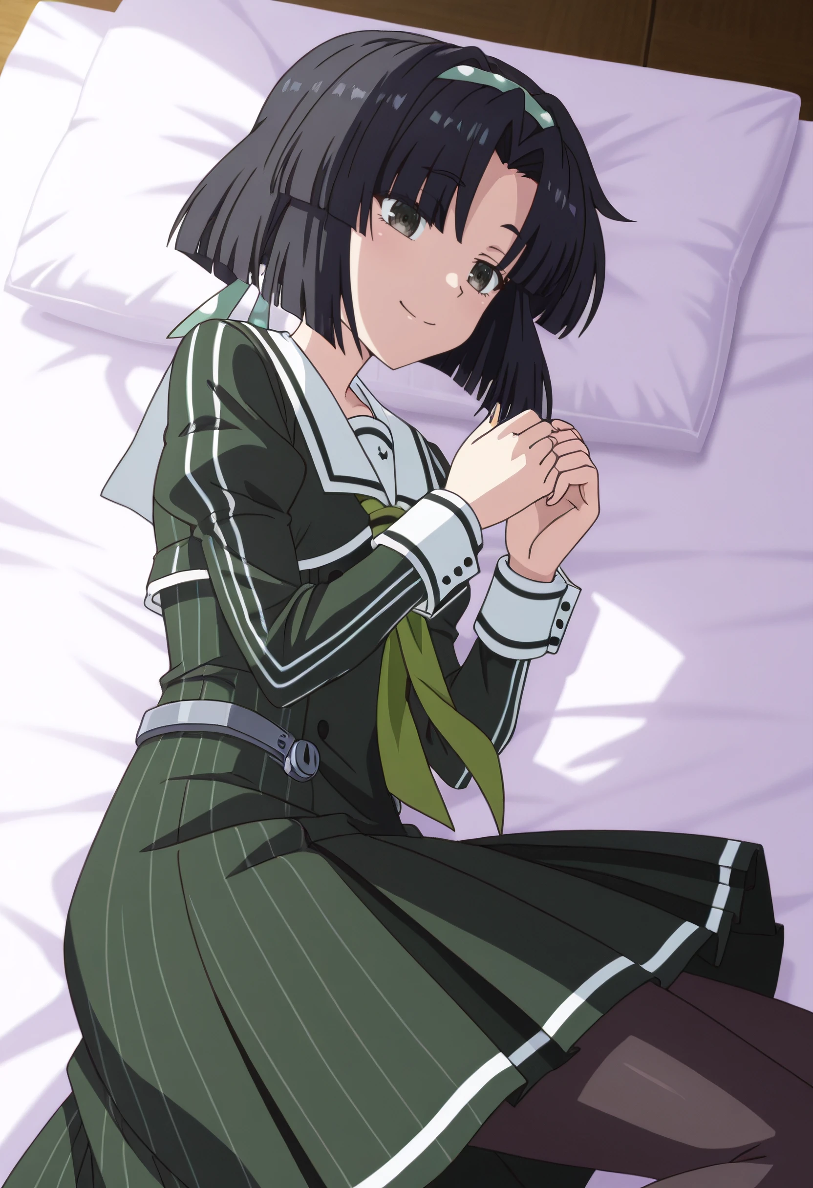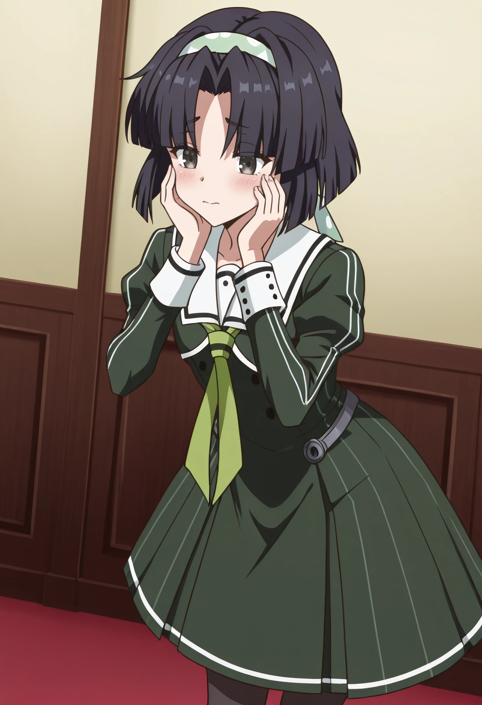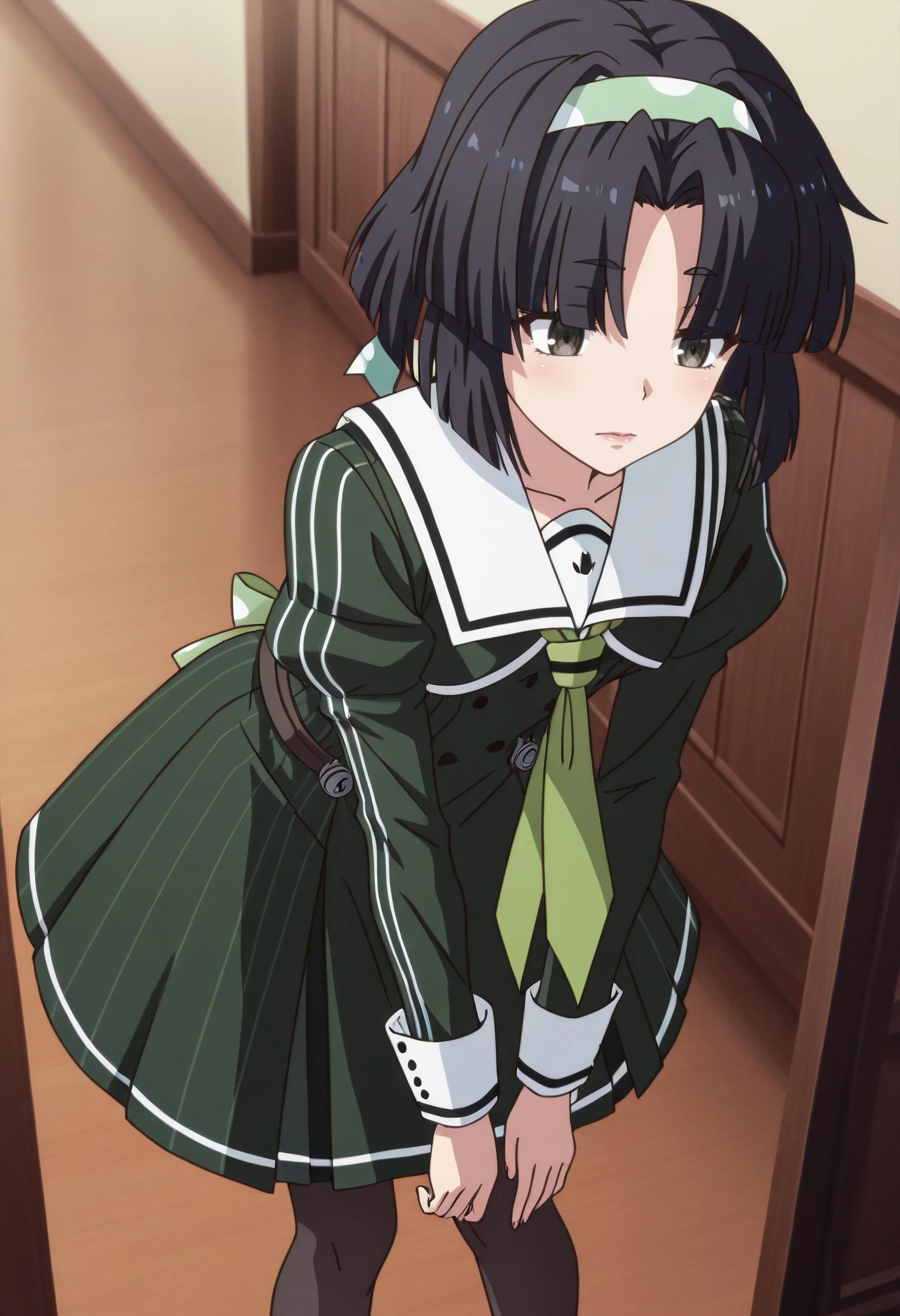 KiyokaSchool, sailor collar, white sailor collar, school uniform, hairband, ribbon, white hairband, sailor dress, long sleeves, green hairband, neckerchief, puffy sleeves, juliet sleeves, green dress, hair ribbon, green neckerchief, medium dress, pleated dress, green ribbon, serafuku, pantyhose, sleeve cuffs, black pantyhose,