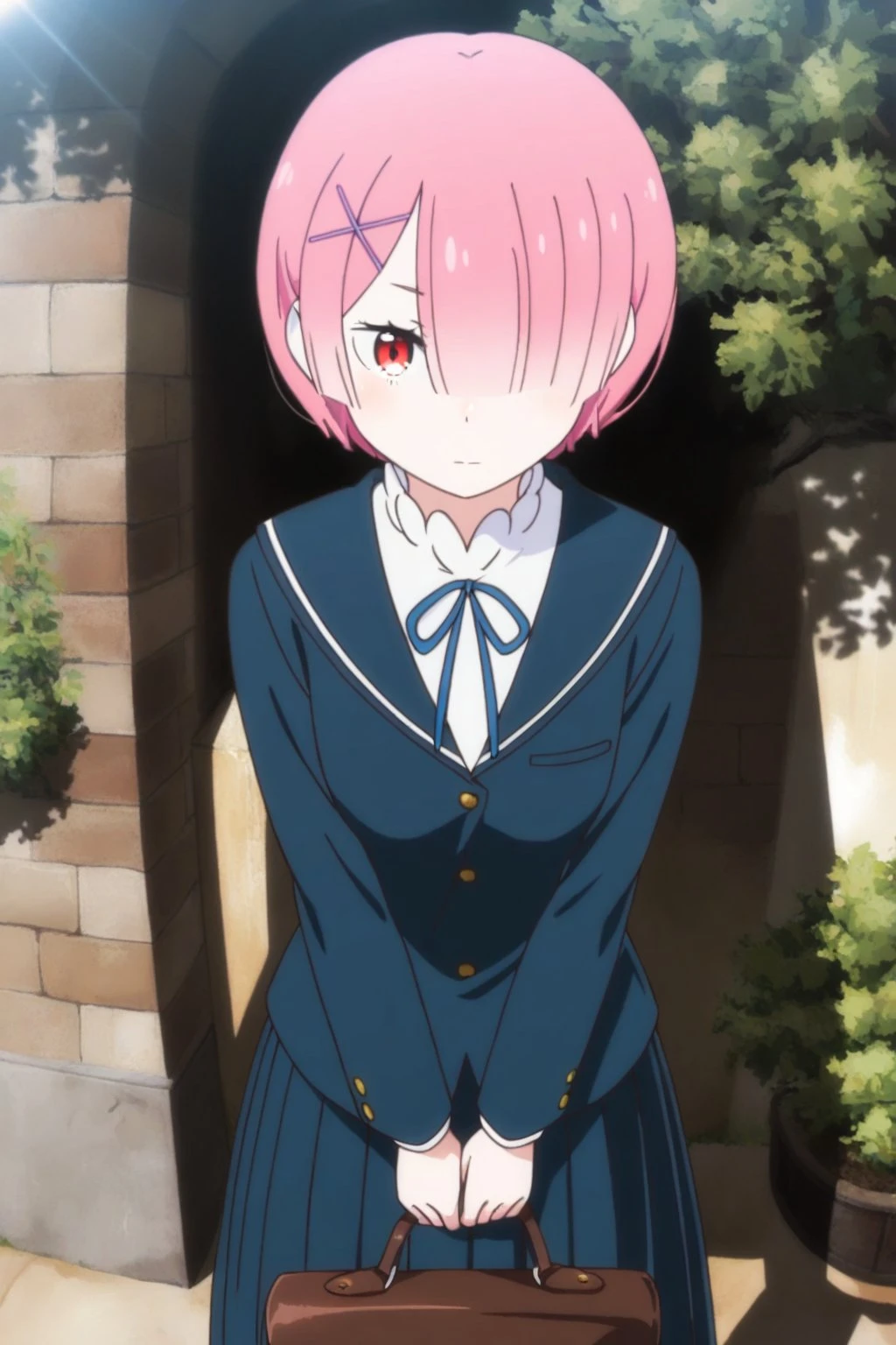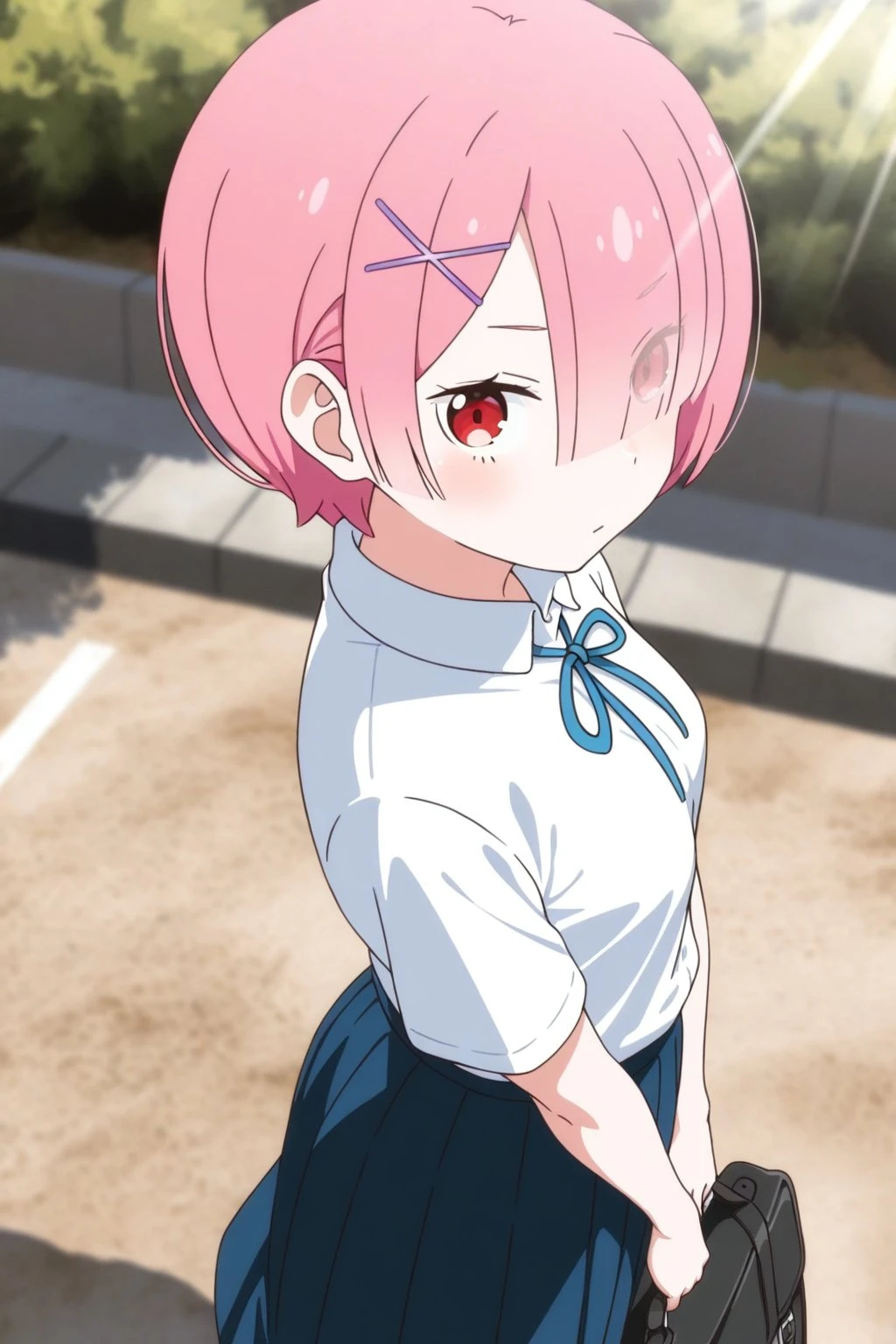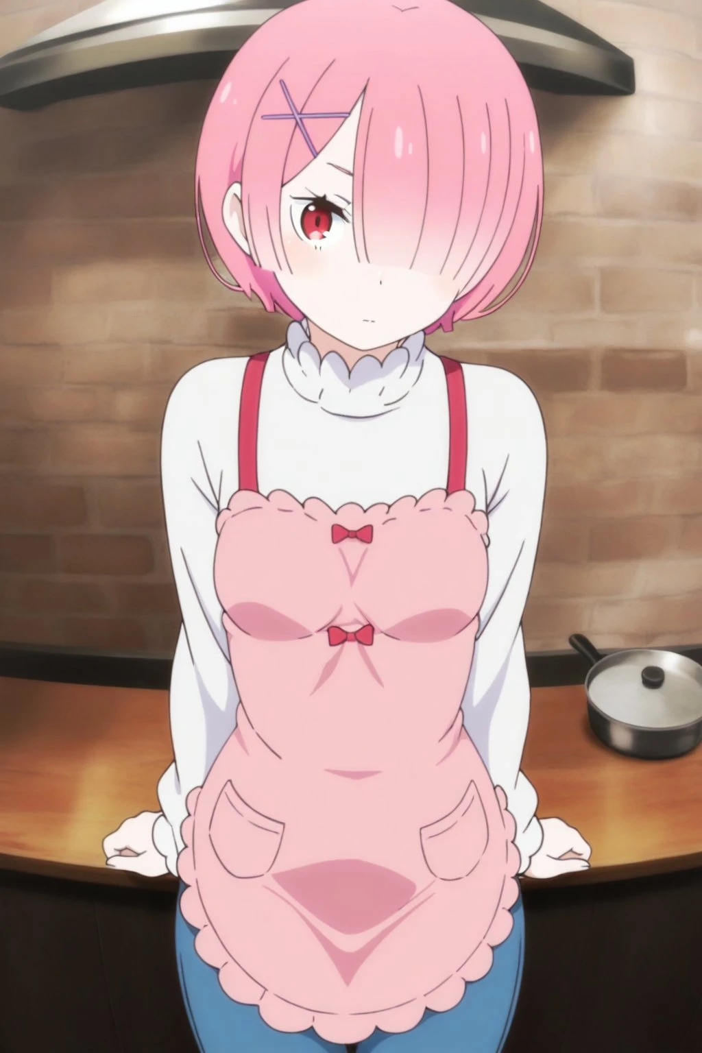 Prompt : masterpiece, best quality, amazing quality, fine details, Ram, solo, breasts, small breasts, short hair, pink hair, bangs, hair over one eye, red eyes,