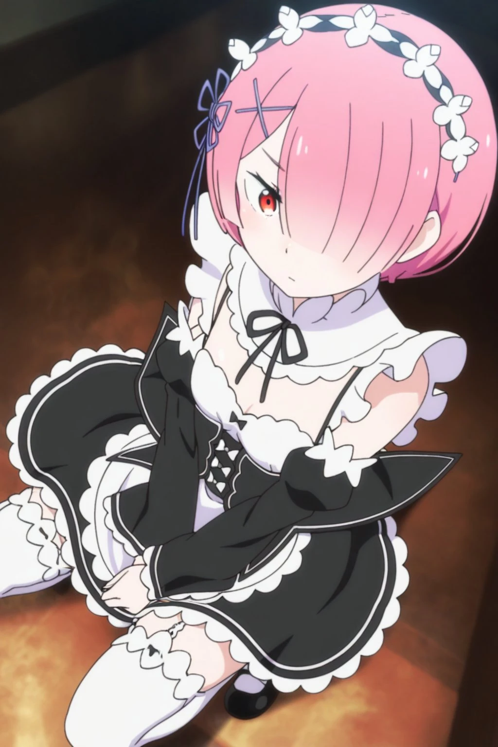 Outfit : hair ornament, x hair ornament, maid, roswaal mansion maid uniform, head wreath, maid headdress, neck ribbon, black neck ribbon, frills, long sleeves, detached sleeves, skirt, black skirt, apron, thighhighs, white thighhighs, shoes, black footwear, ribbon, hair ribbon, ribbon trim, black ribbon,
