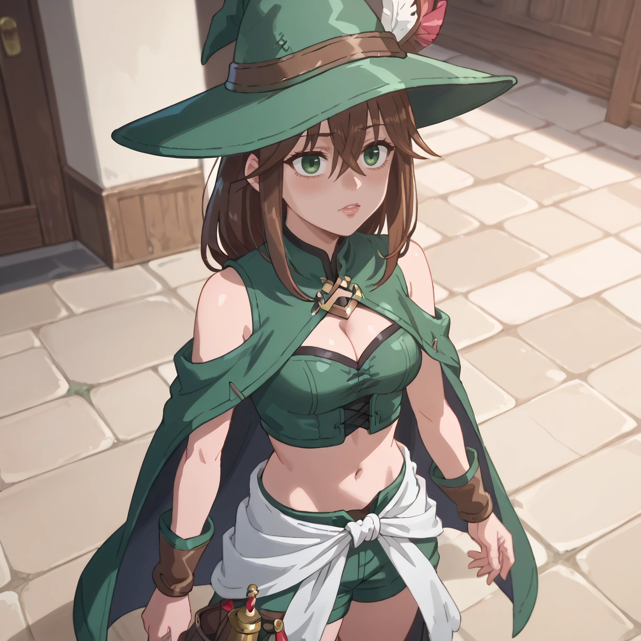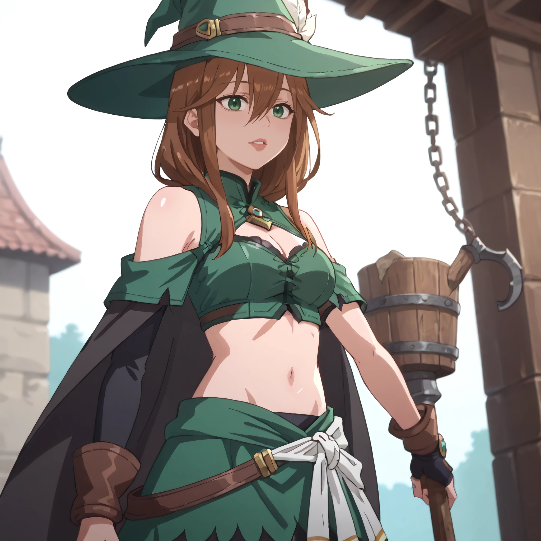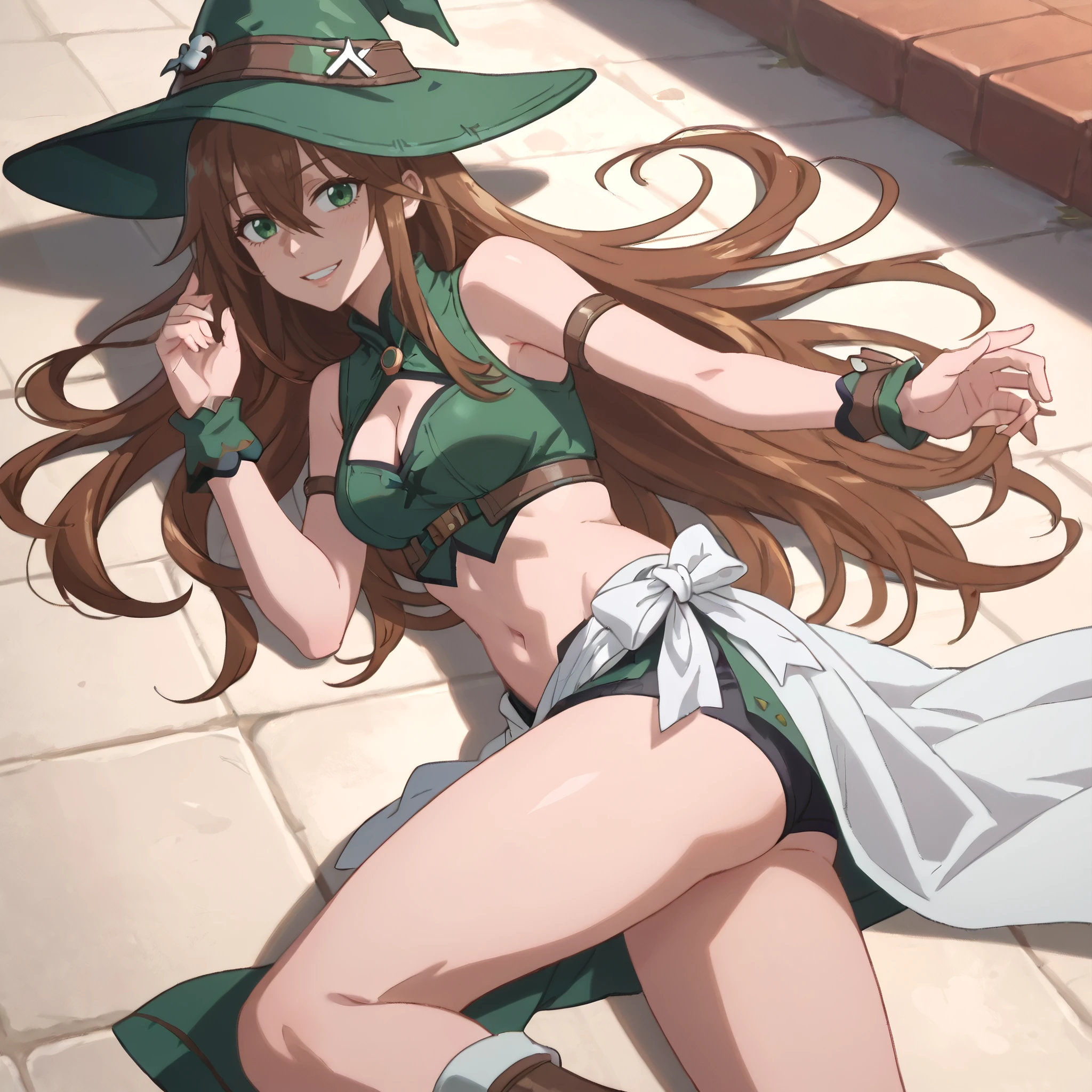 hat, witch hat, bare shoulders, clothing cutout, sleeveless, green headwear, cleavage, cleavage cutout, green dress, boots, midriff, navel,