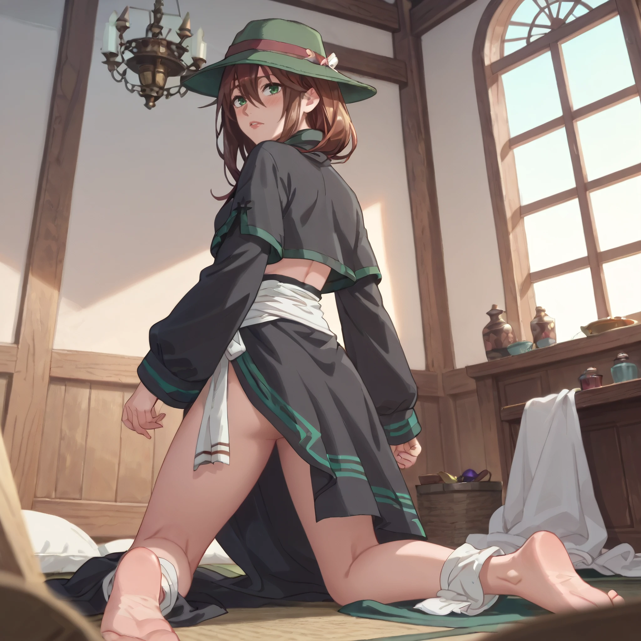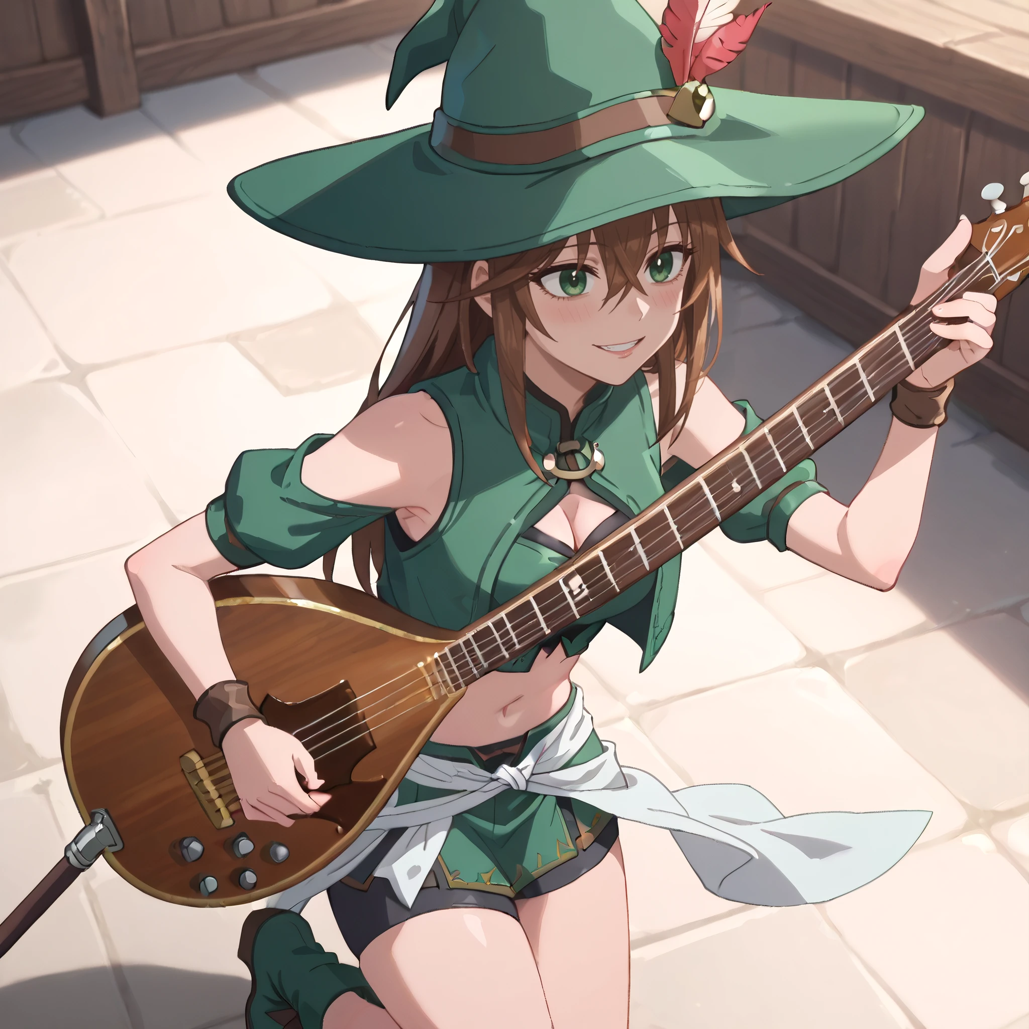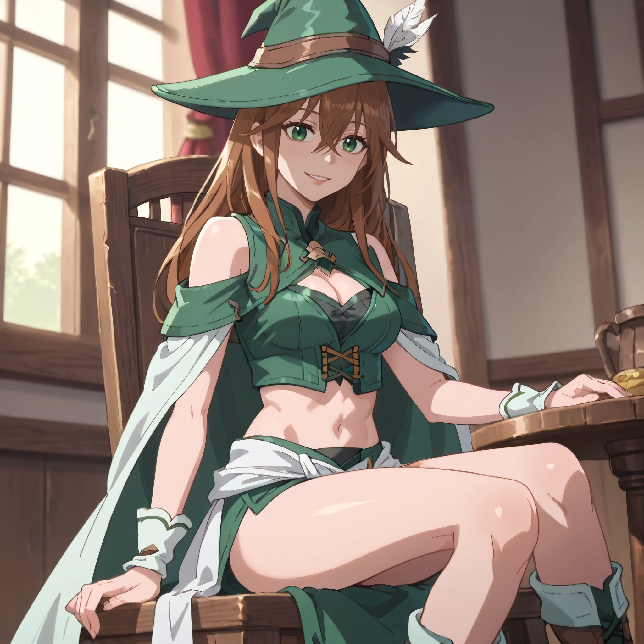 hat, witch hat, bare shoulders, clothing cutout, sleeveless, green headwear, cleavage, cleavage cutout, green dress, boots, midriff, navel,