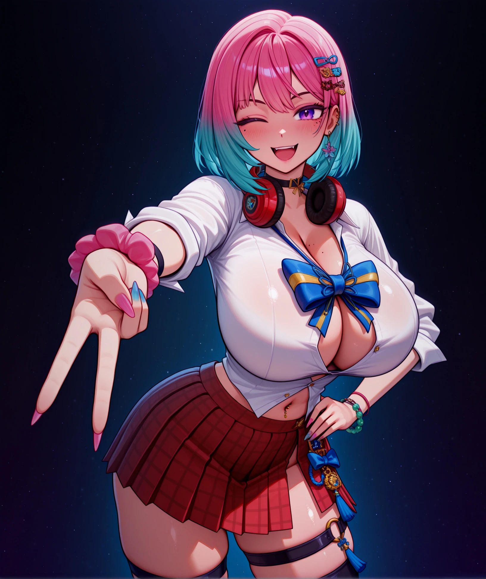 rygg, multicolored hair, hair ornament, mole under eye, purple eyes, headphones around neck, single earring, choker, two-tone nails, partially unbuttoned shirt, bowtie, sleeves pushed up, navel piercing, red pleated half-skirt, plaid skirt, wristband, wristwatch, bracelet, wrist scrunchie, mismatched wrists, charm, yaopei, tassel, accessories, asymmetrical legwear, blue thigh strap, bare leg, single black thighhigh, single leg warmer, red high heelsYou can get her blonde gyaru colors with the following tags: