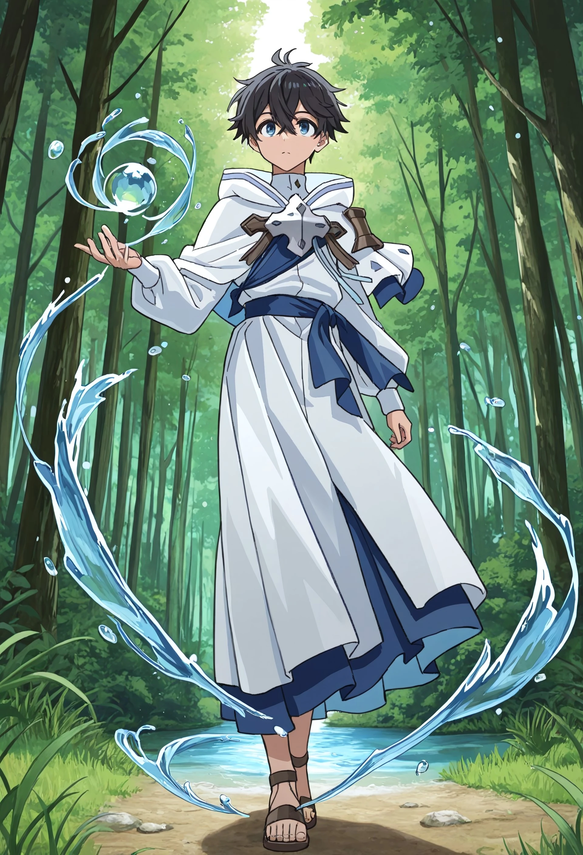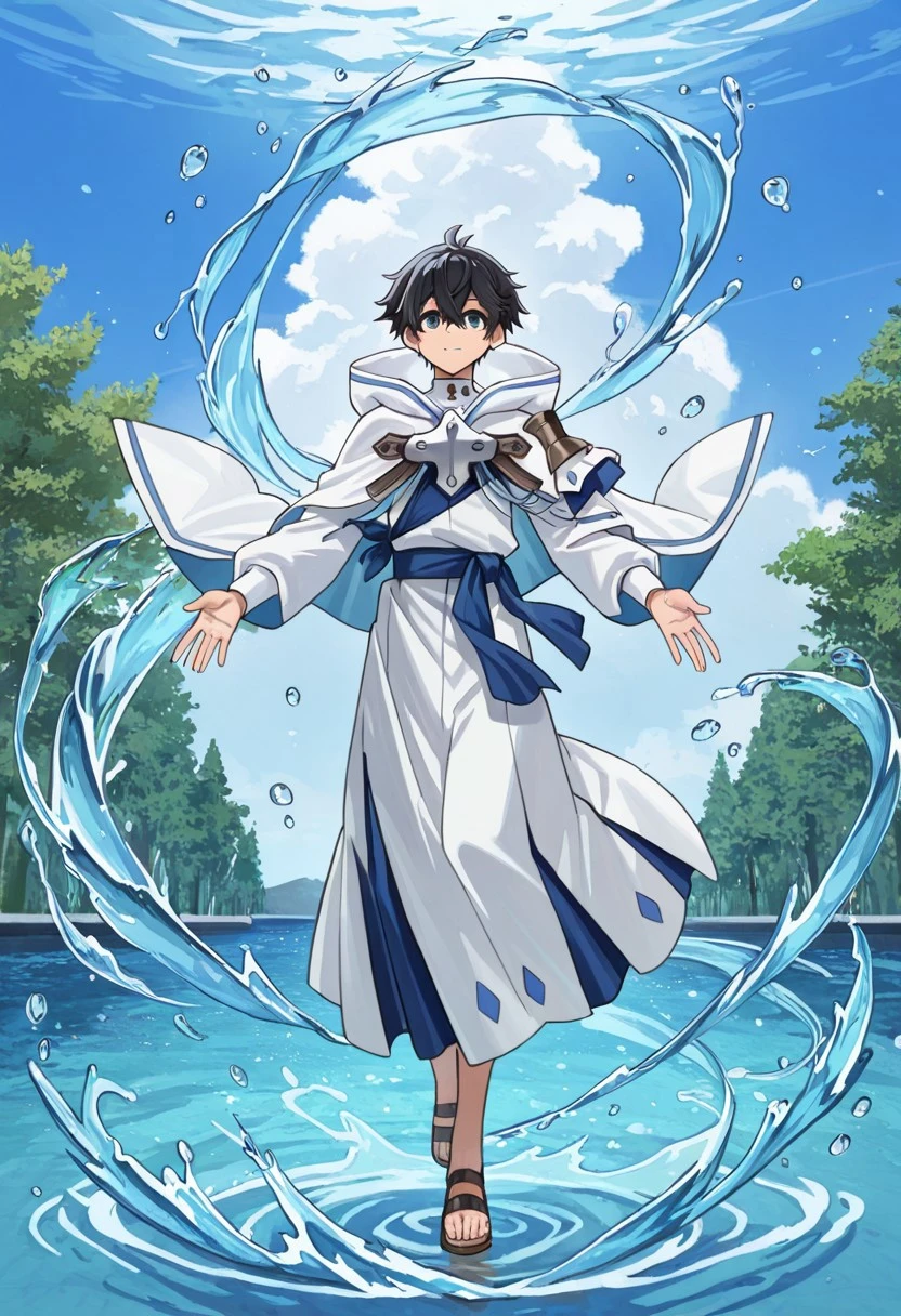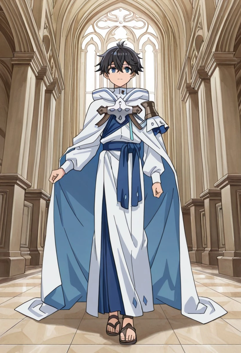 Ryo_WM, blue eyes, black hair, white robe, silver cross, blue sash