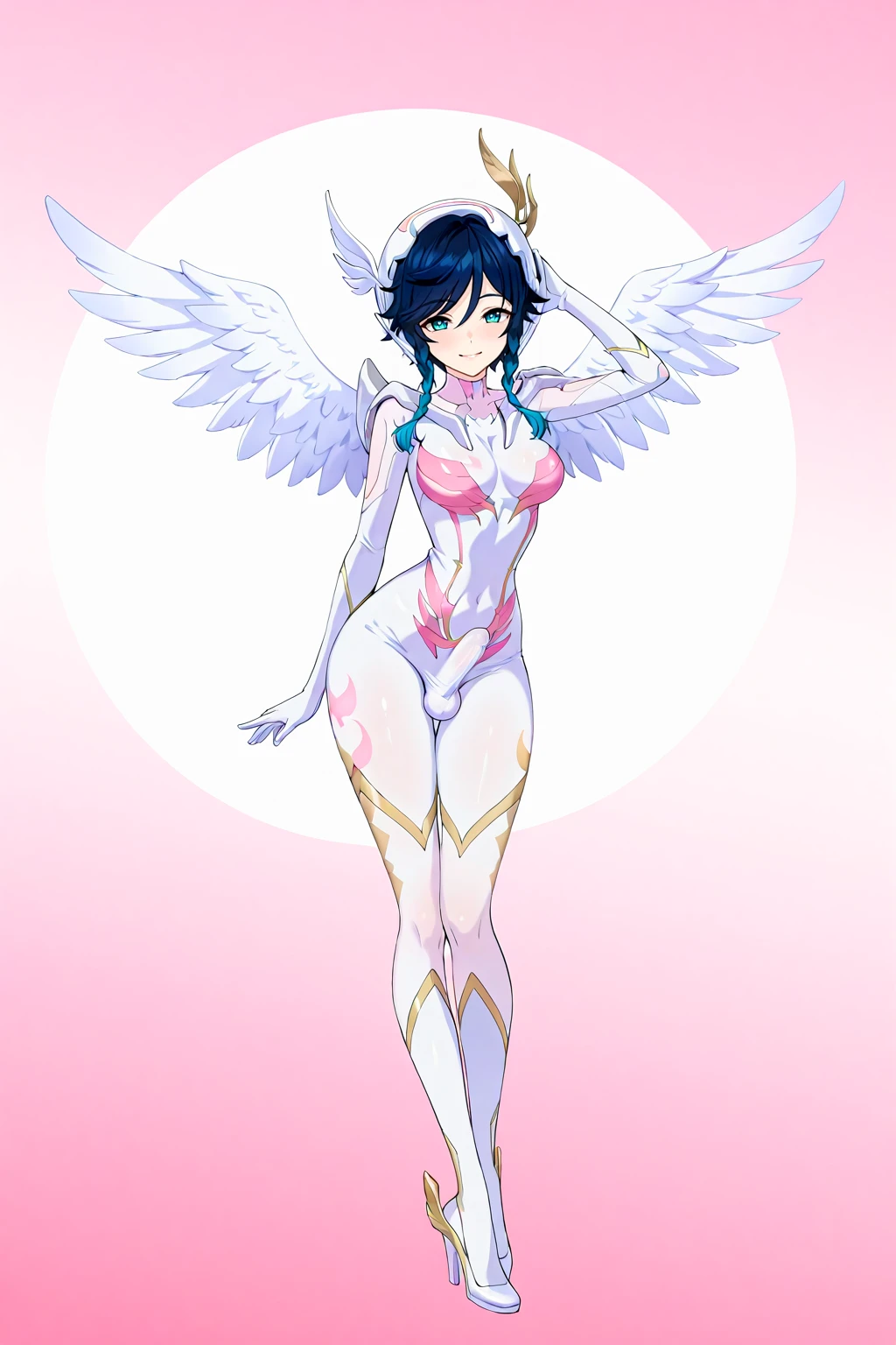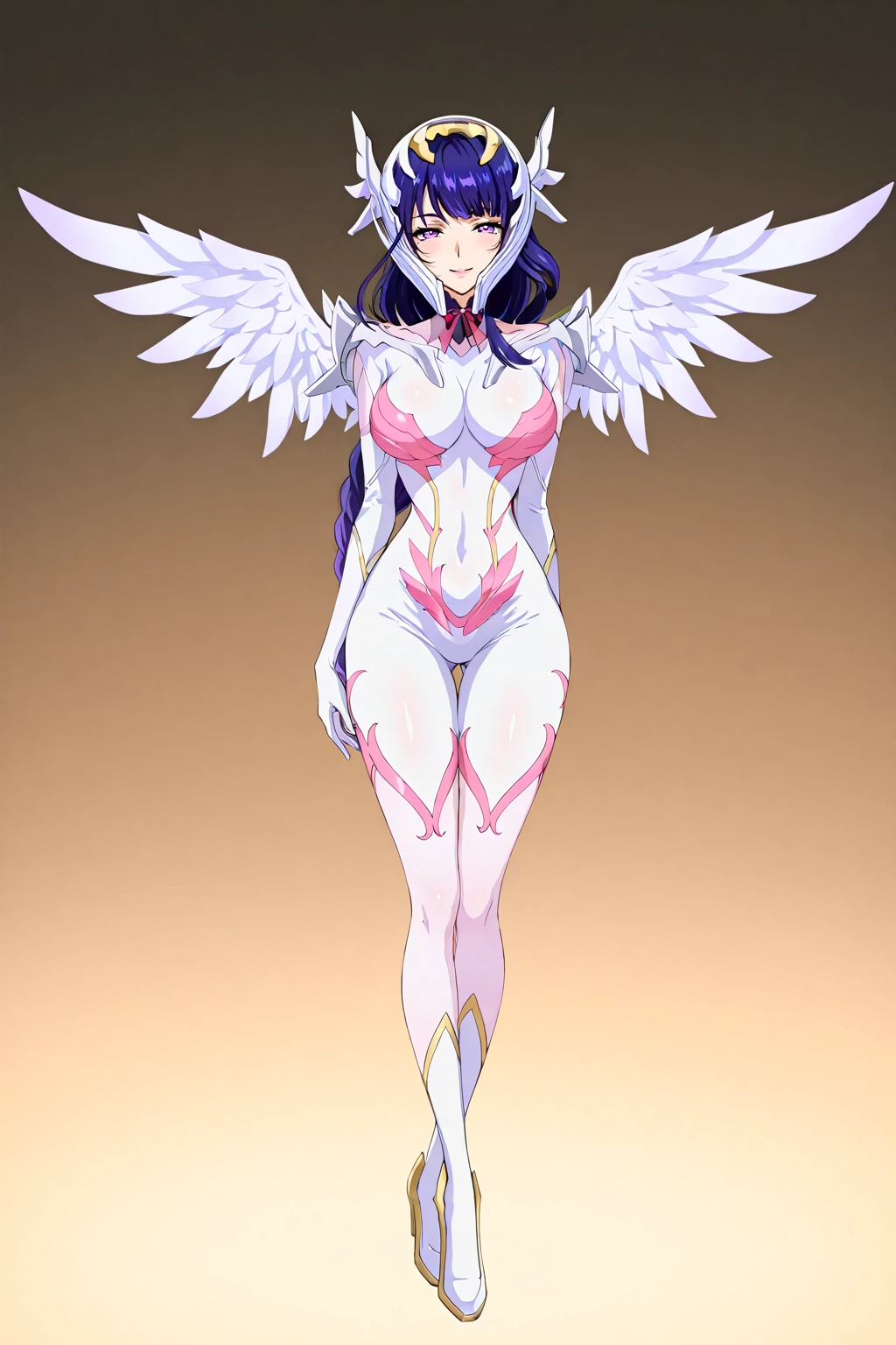 lacus pilot suit, white bodysuit with pink pattern, wings, helmet