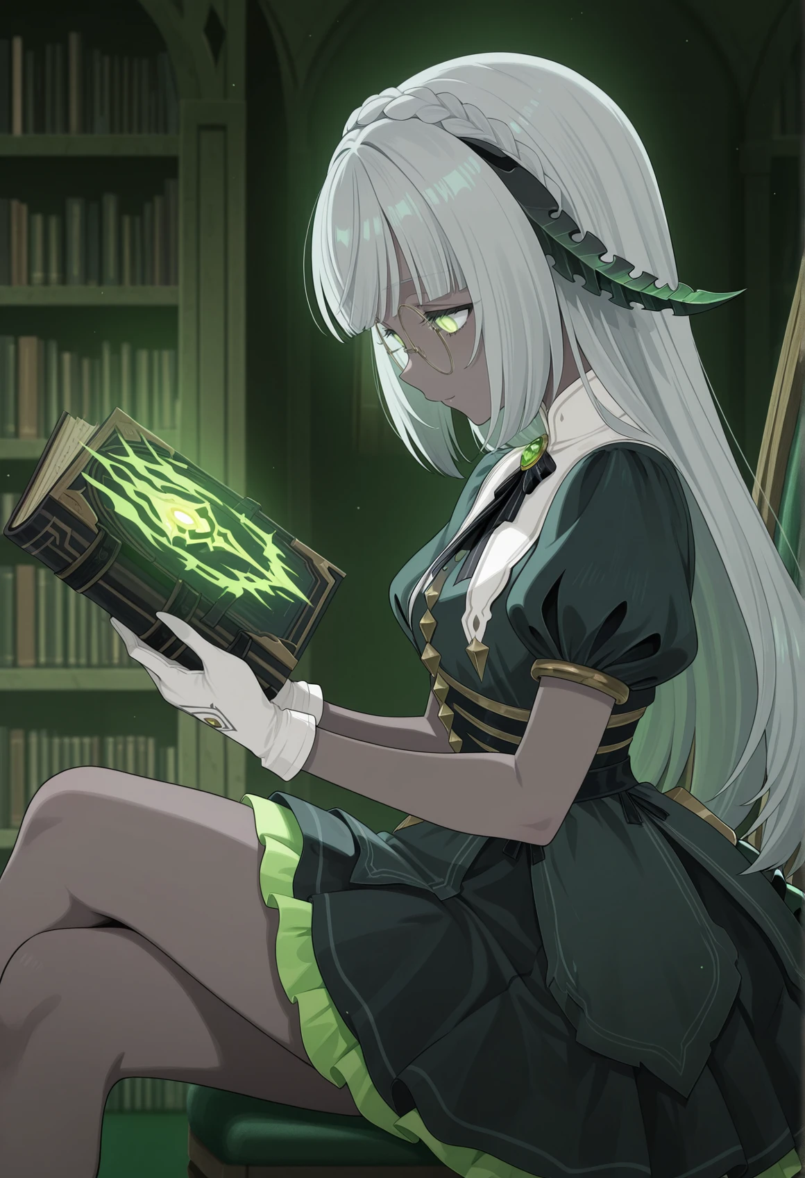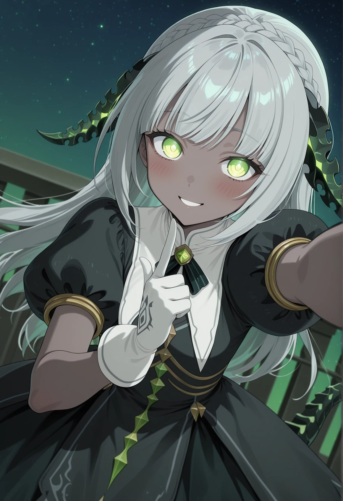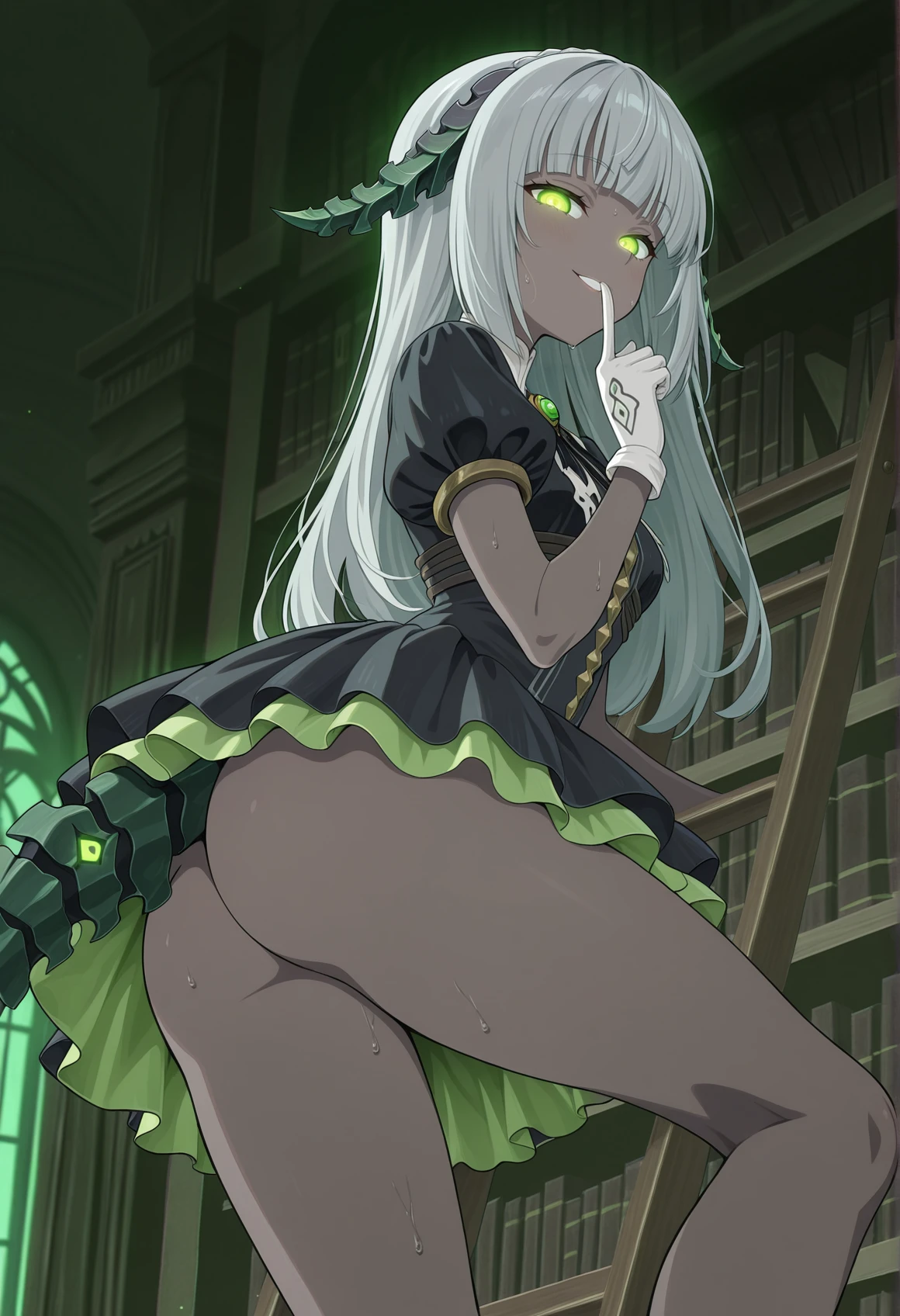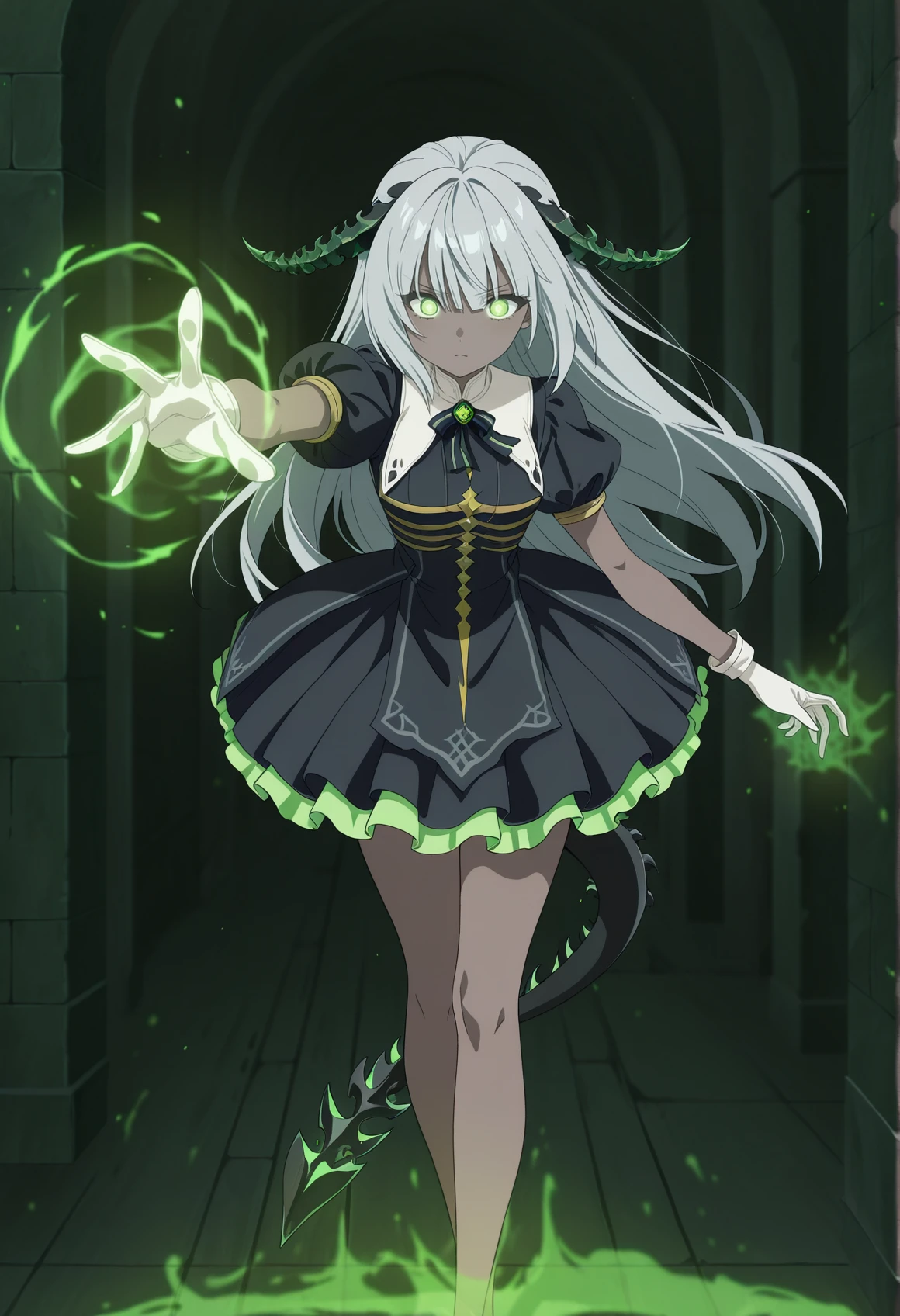 dark skin, green eyes, grey hair, long hair, horns, tail, short dress, puffy sleeves, short sleeves, lace trim, brooch, gloves