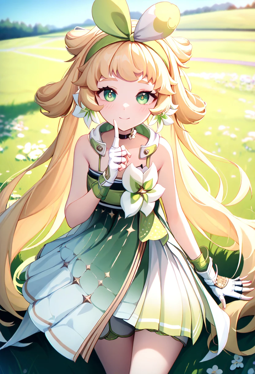 green dress, white shorts, white gloves, fingerless gloves, flower earrings
