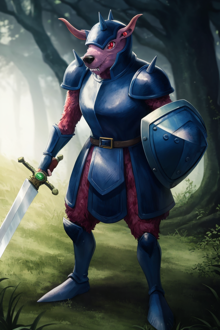 Prompt: beaverwarrior, holding, horns, holding weapon, armor, pokemon (creature), holding sword, helmet, shield
