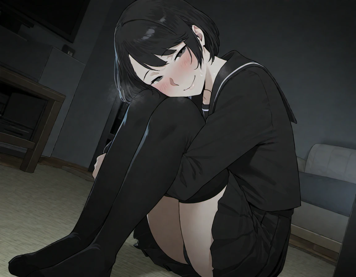 black shirt,serafuku,pleated skirt,black thighhighs