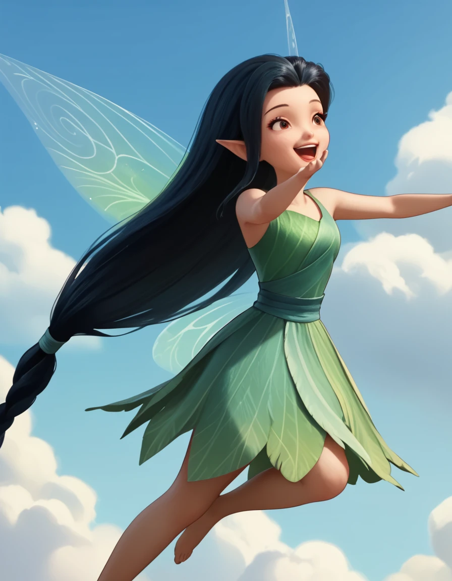Silvermist, fairy, pointy ears, black hair, brown eyes, very long hair, green dress