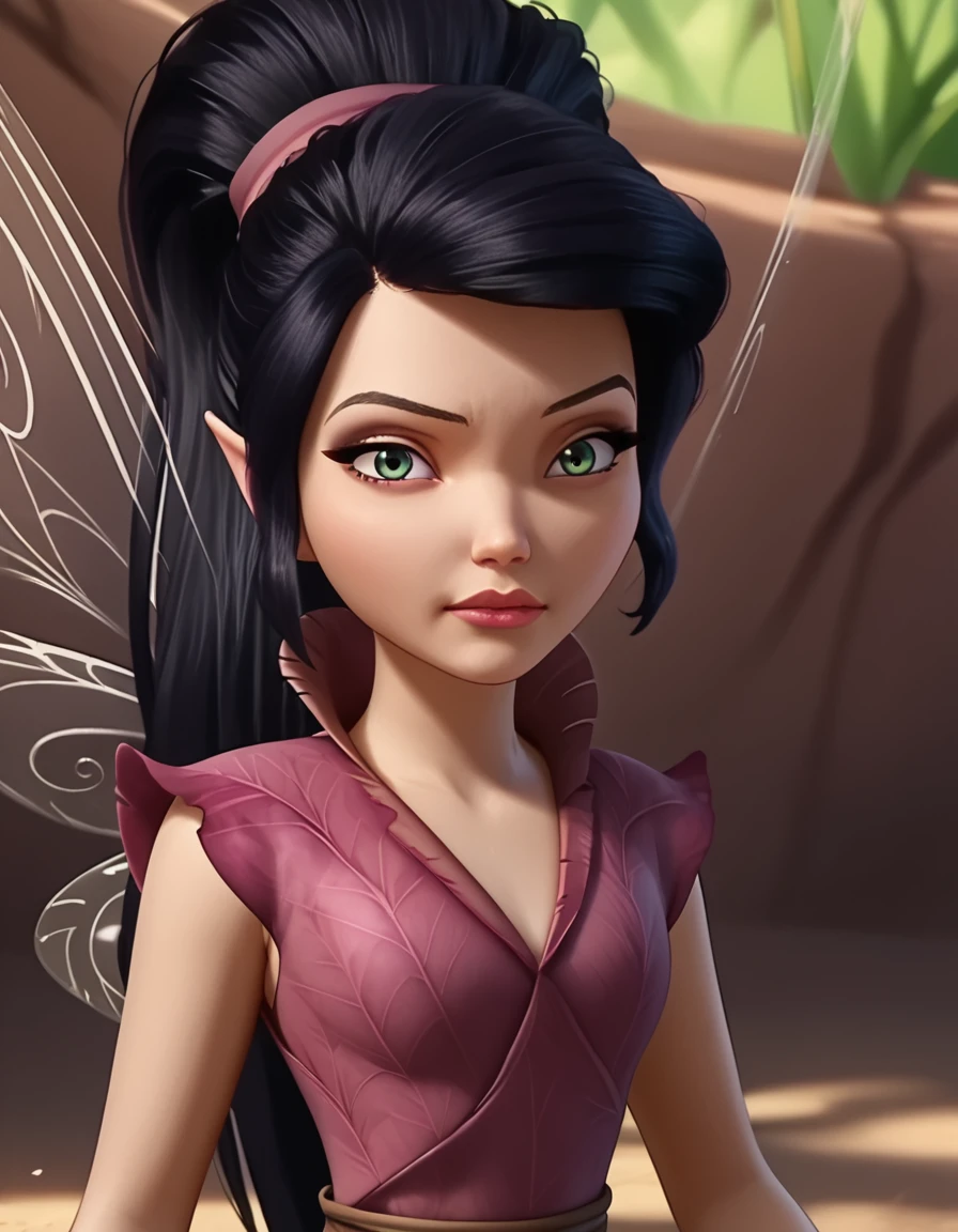 Vidia, fairy, pointy ears, black hair, green eyes, ponytail, pink dress,