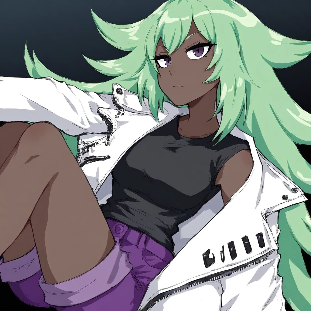 noize_river_city_girls, dark skin, long hair, green hair, hair over one eye