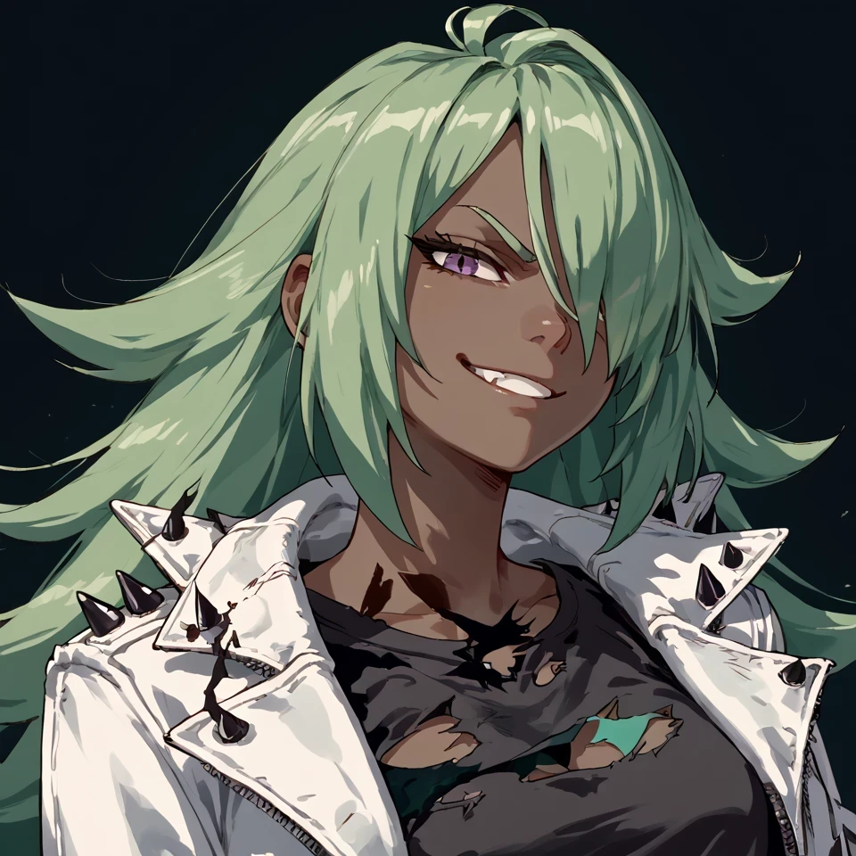 white leather jacket with spikes, black shirt, purple shorts, smirk, portrait, torn shirt