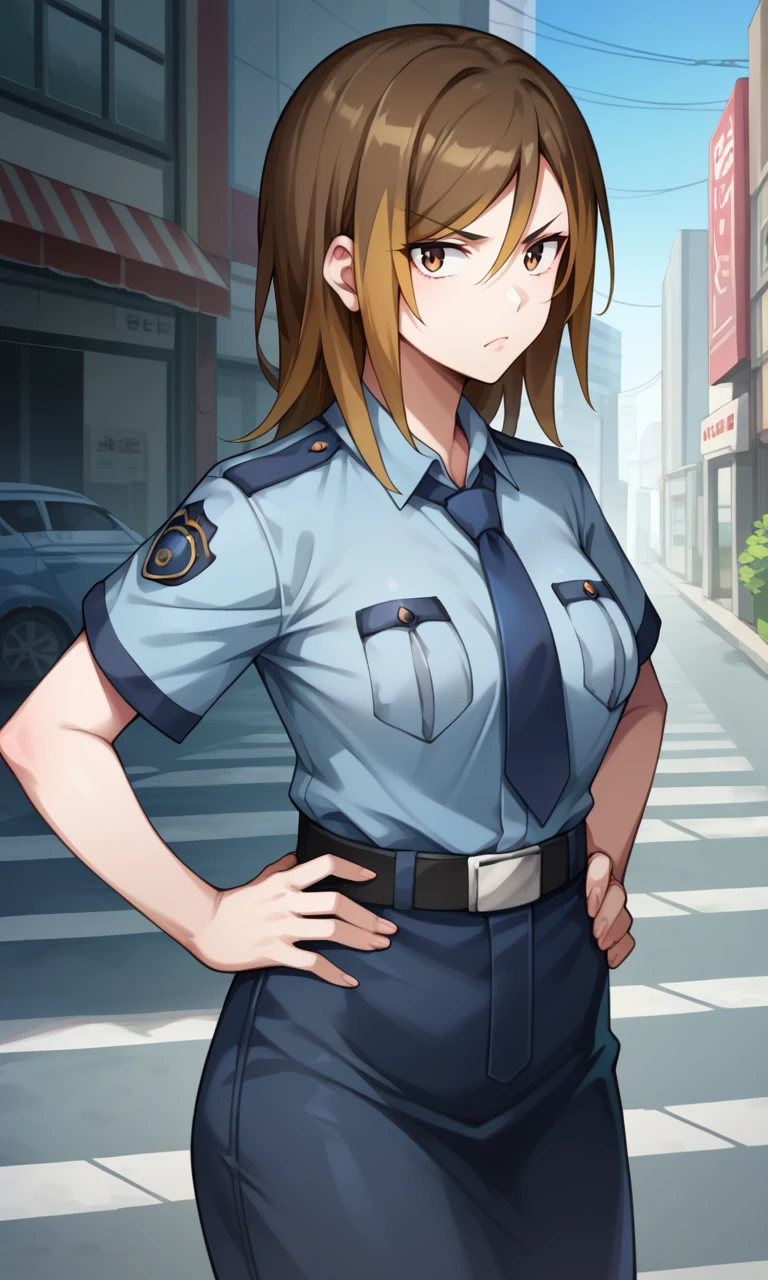 Date Makiko, policewoman, police uniform, blue necktie, blue shirt, breast pocket, short sleeves, blue miniskirt, tsurime, brown eyes, brown hair, two-tone hair, belt, bare legs, v-shaped eyebrows, black shoes