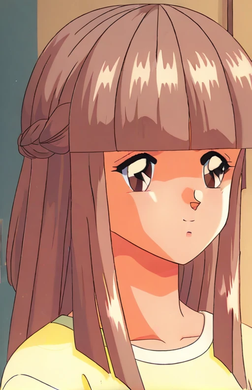 Anime Coloring<lora:Mikihara Megumi - Tokimeki Memorial 1.4:0.8>,1girl, light brown hair, long hair, brown eyes, blunt bangs, braid, Small ,retro artstyle,