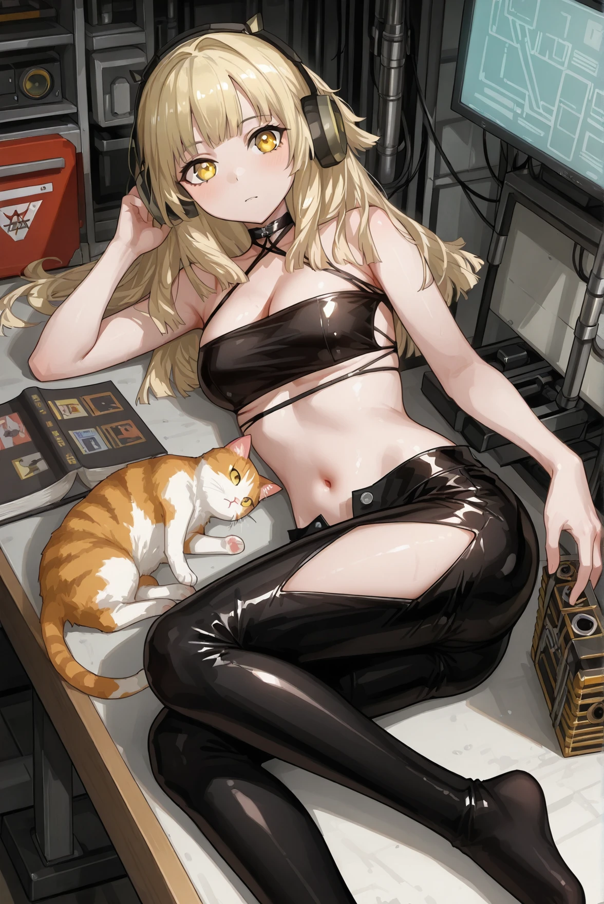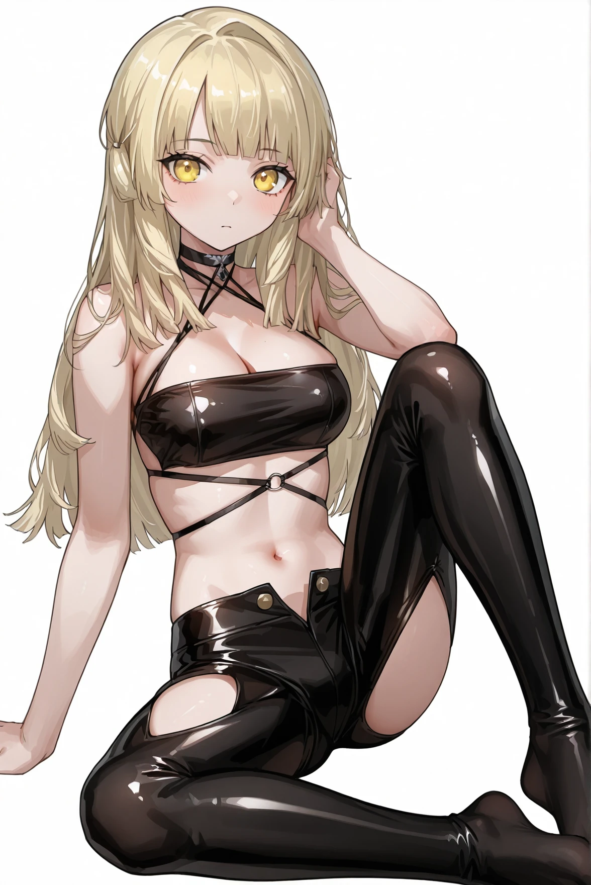 black choker, criss-cross halter, cleavage, bare shoulders, tube top, navel, midriff, thigh cutout, latex legging, latex pantyhose, no shoes, footed leggings