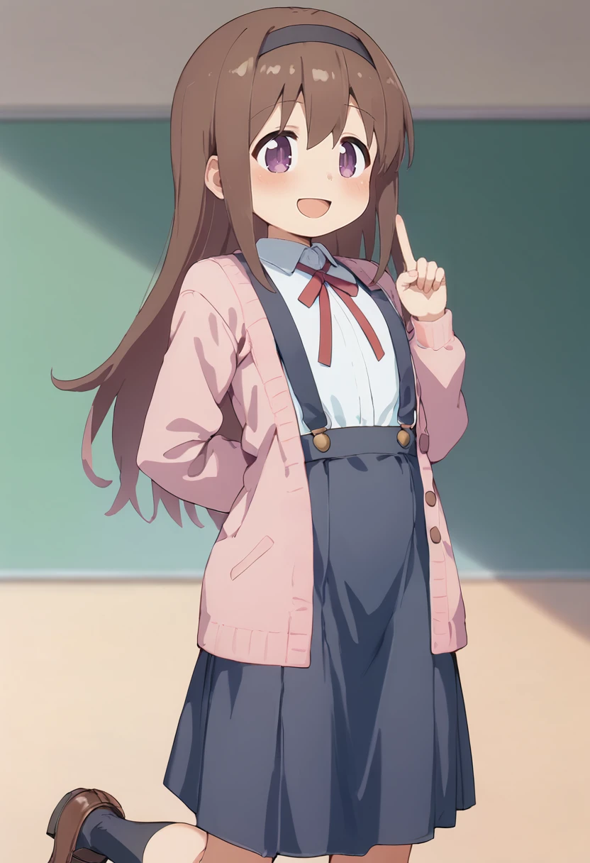 nodoka-default,fushimi_nodoka,purple eyes,long hair, brown hair,black hairband,(pink cardigan:1.2),school uniform,long skirt,suspenders,red neck ribbon,black socks,loafers