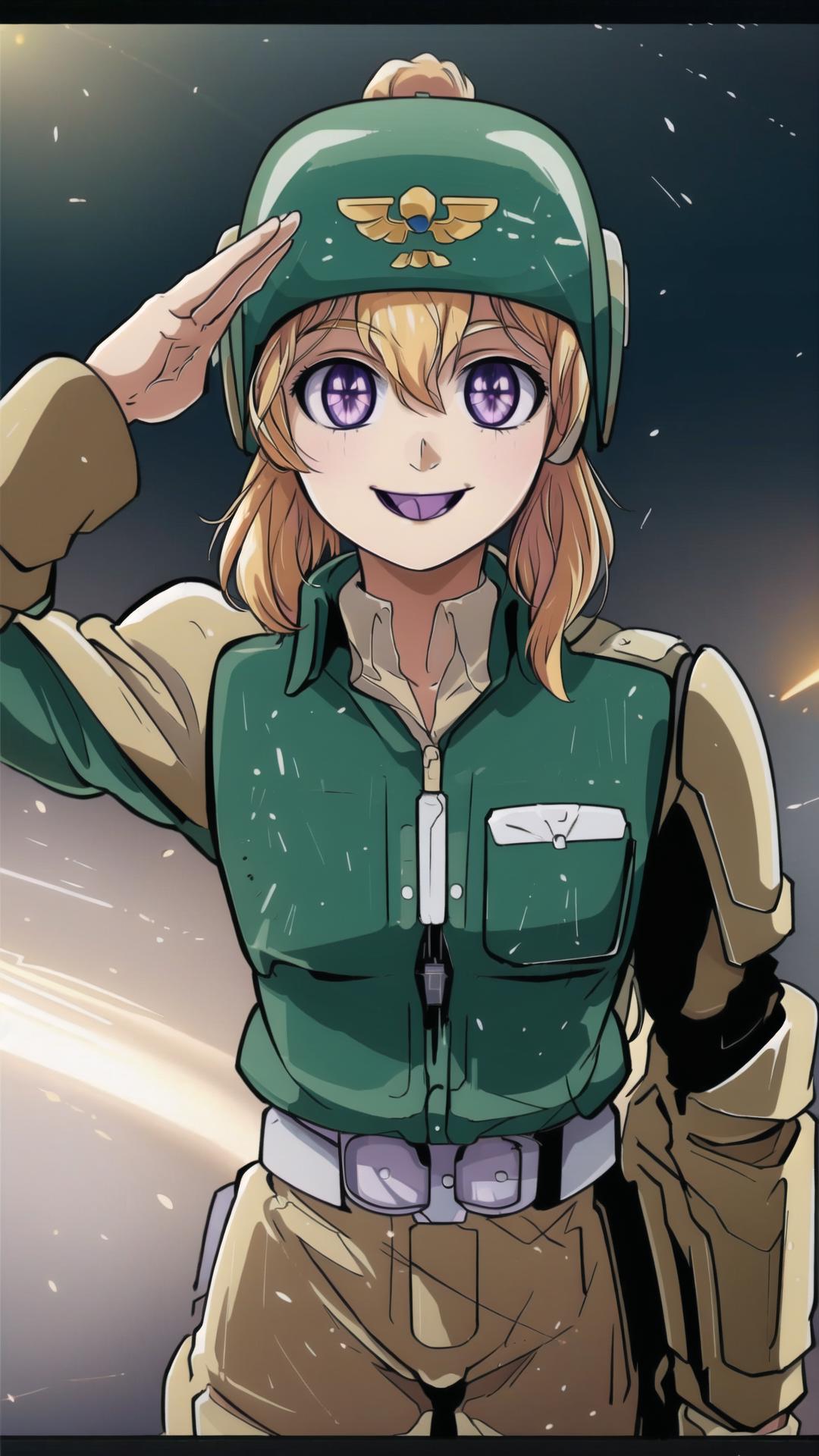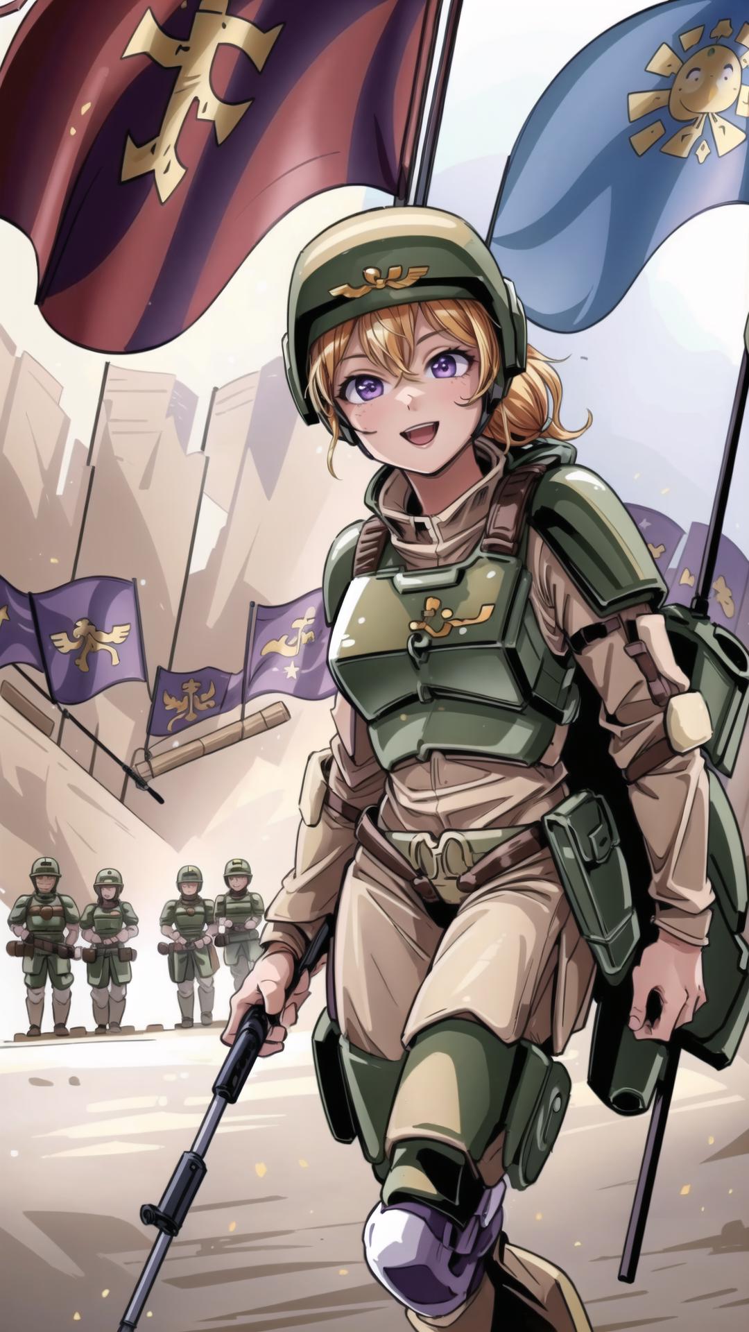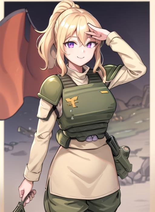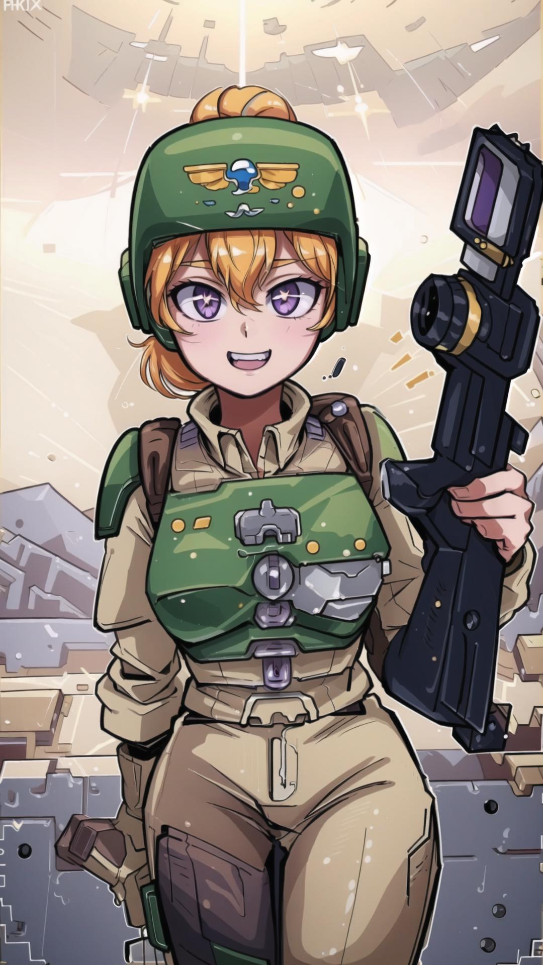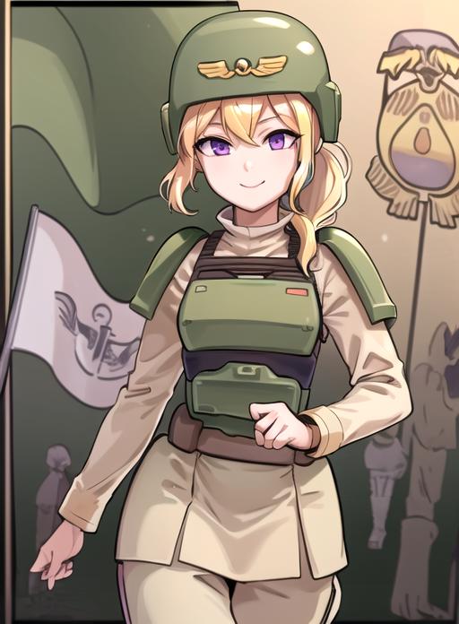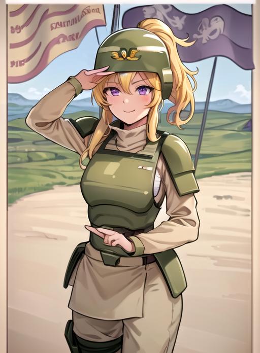 Support me: Ko-fi Commissions:here CadiaChan from Warhammer 40K Tested at 0.7-1 Trigger Words cadiachan, blonde hair,ponytail,purple eyes Add: beige pants, green helmet,beige skirt, Military helmet,military uniform,
