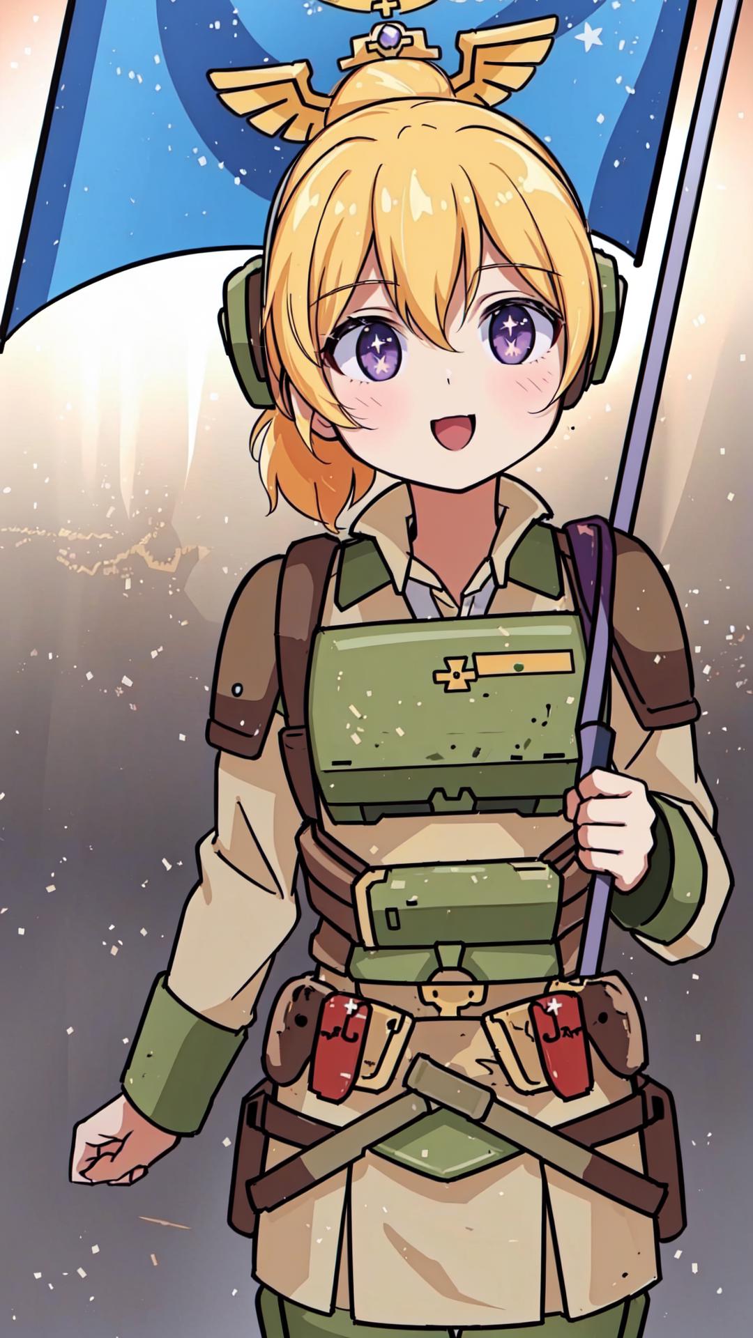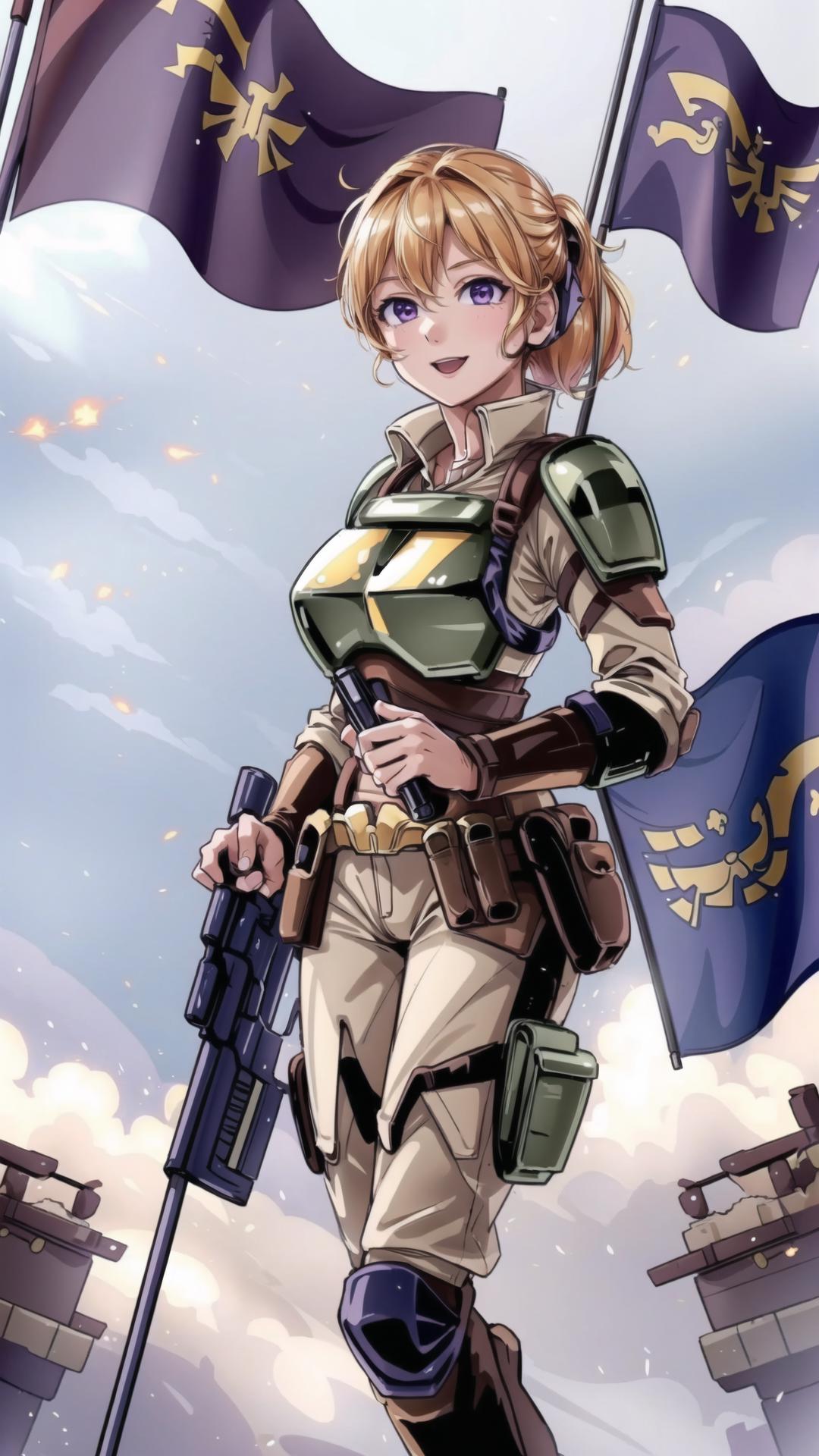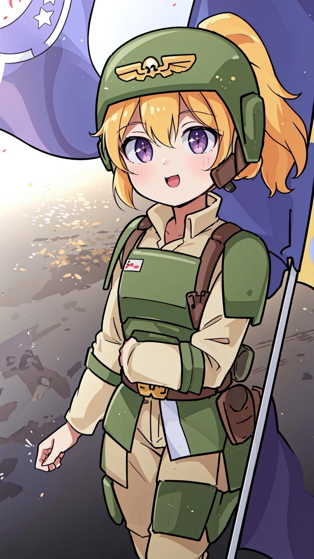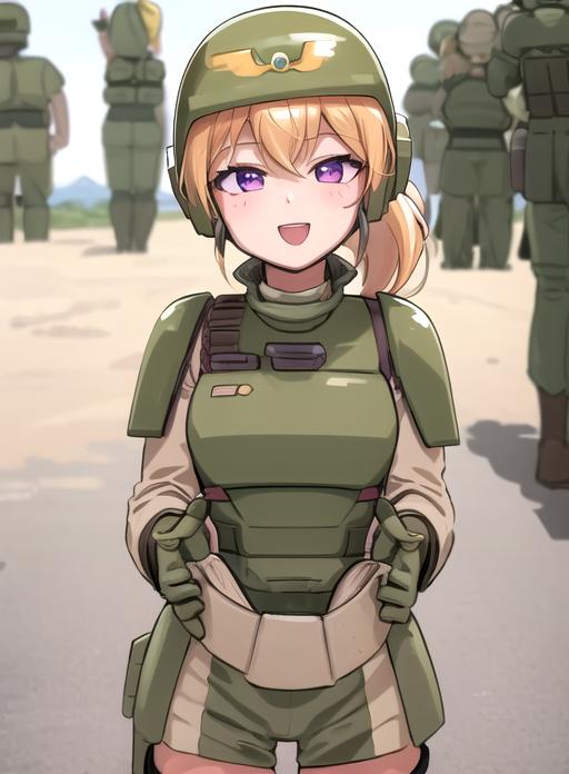 Support me: Ko-fi Commissions:here CadiaChan from Warhammer 40K Tested at 0.7-1 Trigger Words cadiachan, blonde hair,ponytail,purple eyes Add: beige pants, green helmet,beige skirt, Military helmet,military uniform,