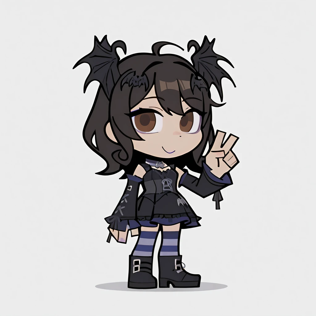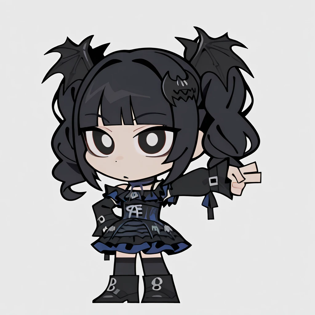 16.- Mea: vancumea, 1girl, solo, black eyes, black hair, bangs hairstyle, black makeup, vanmea dress, bat hair accessories, thigh highs, black boots