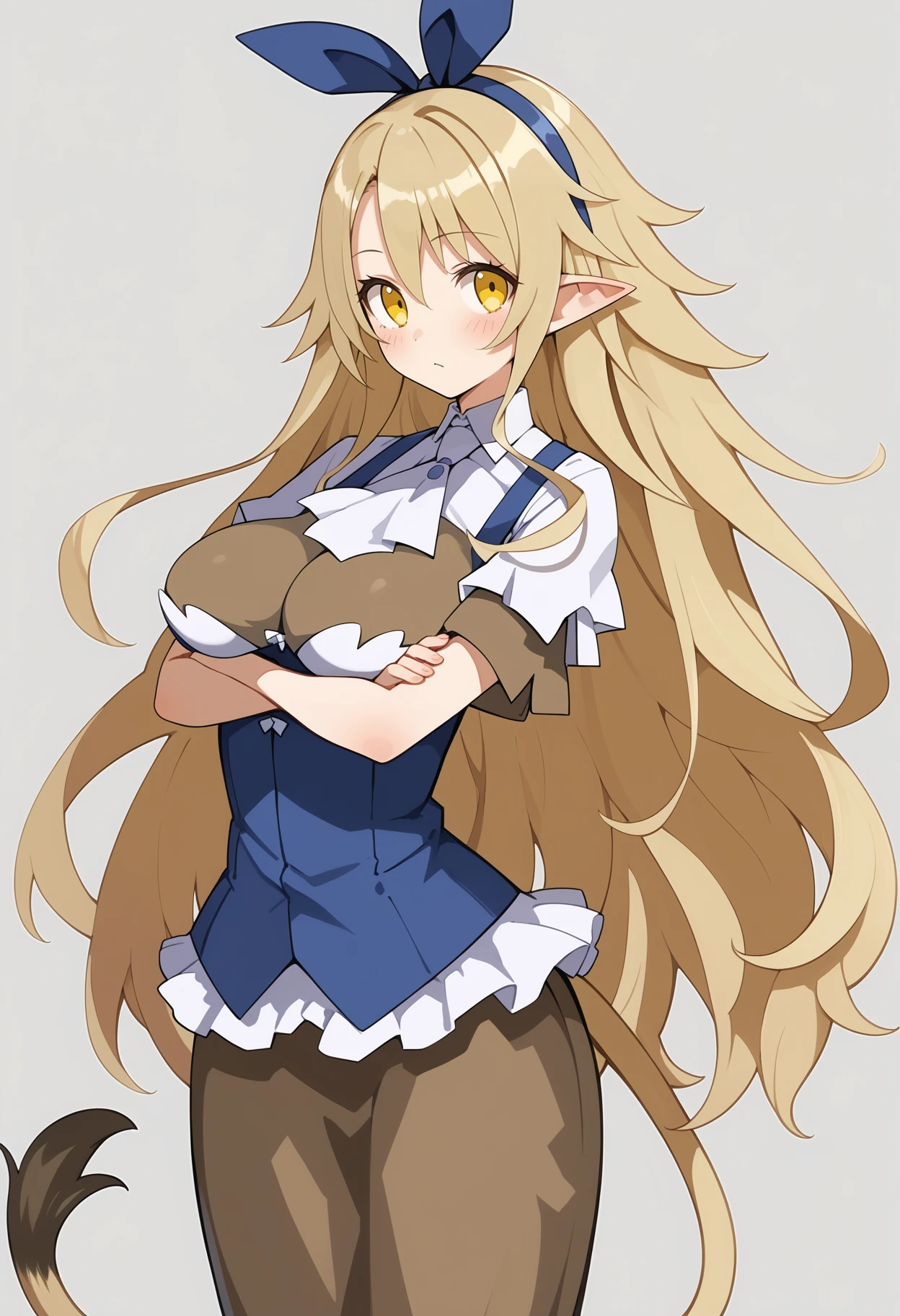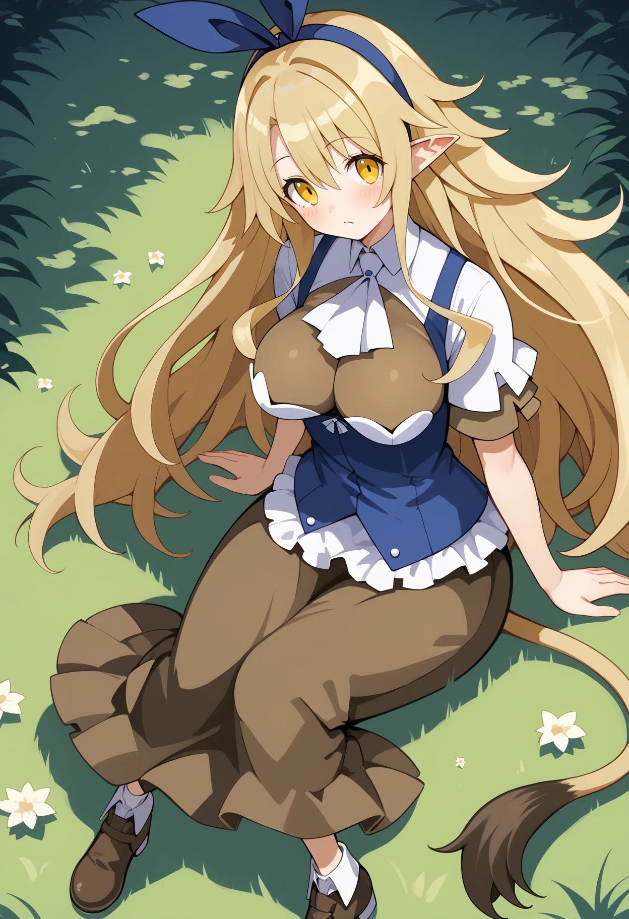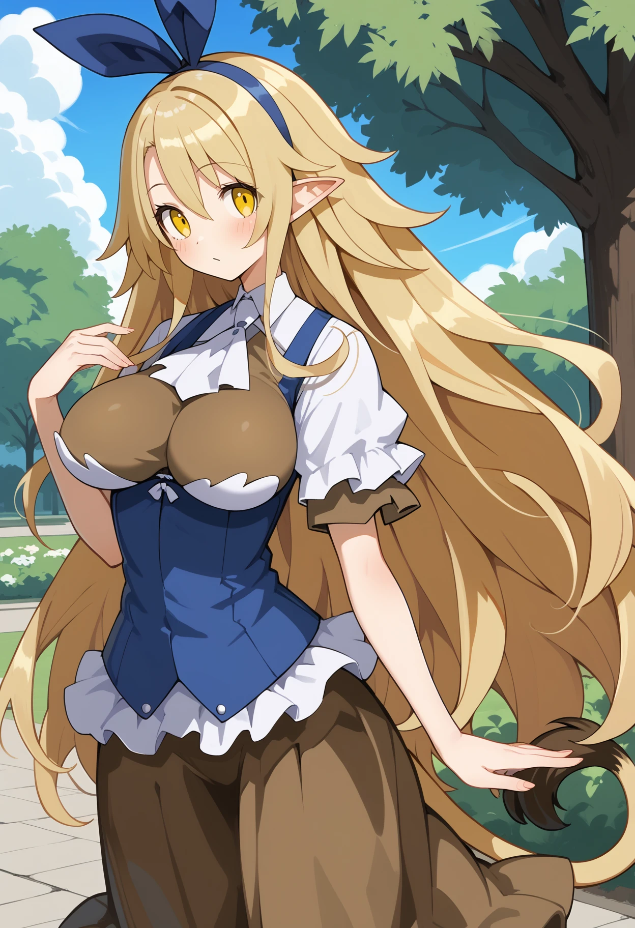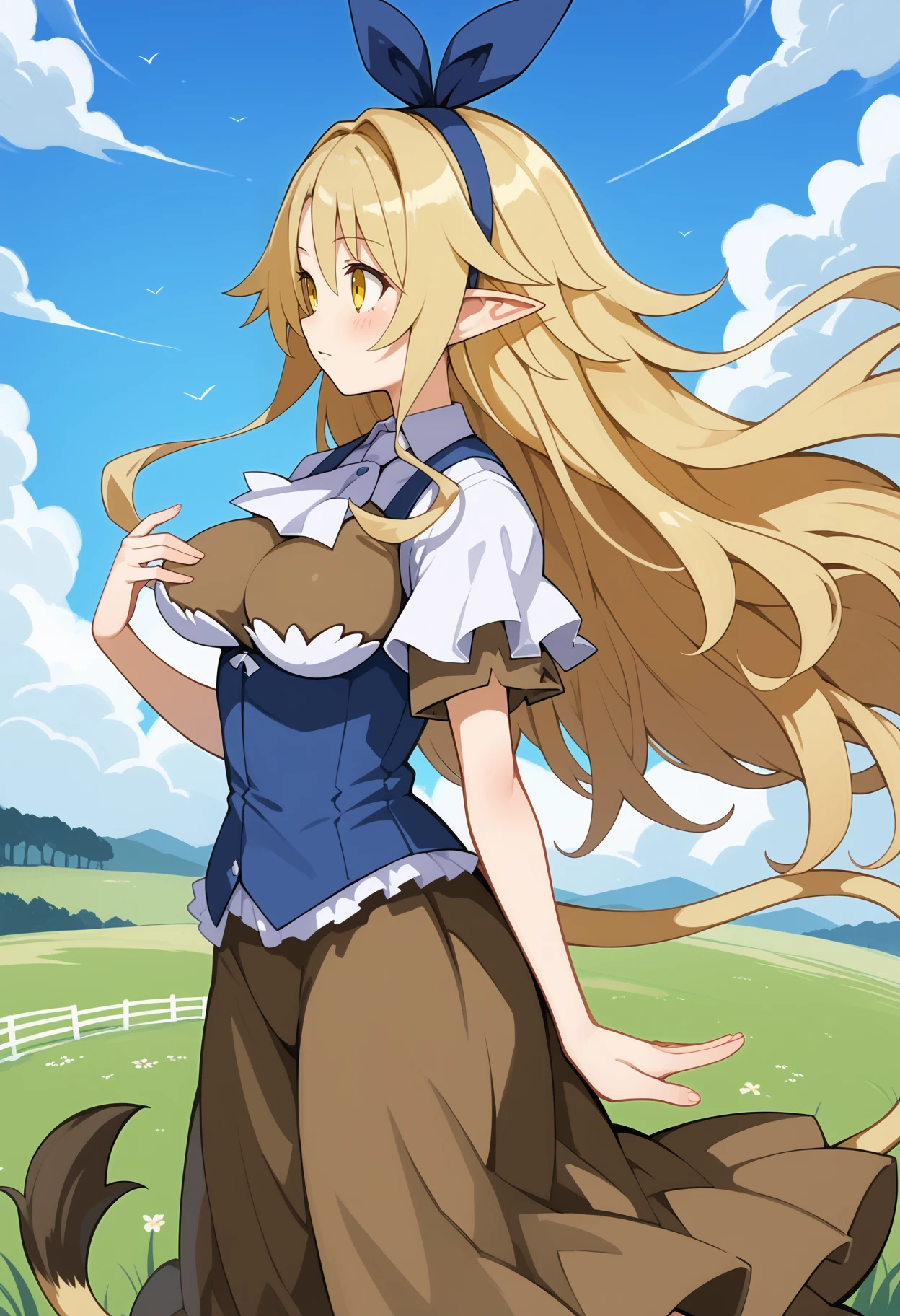 aalieze, long hair, blonde hair, hairband, hair ribbon, yellow eyes, pointy ears, large breasts, tail, white ascot, underbust, brown shirt, white shirt, blue vest, short sleeves, long skirt, brown skirt