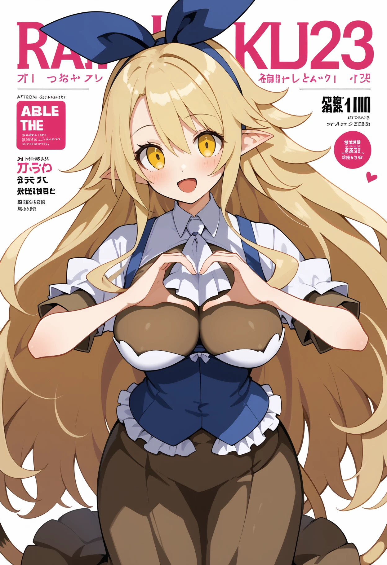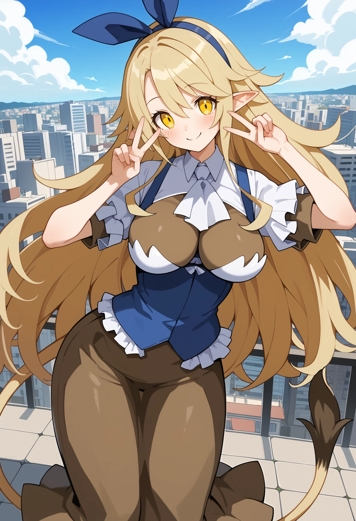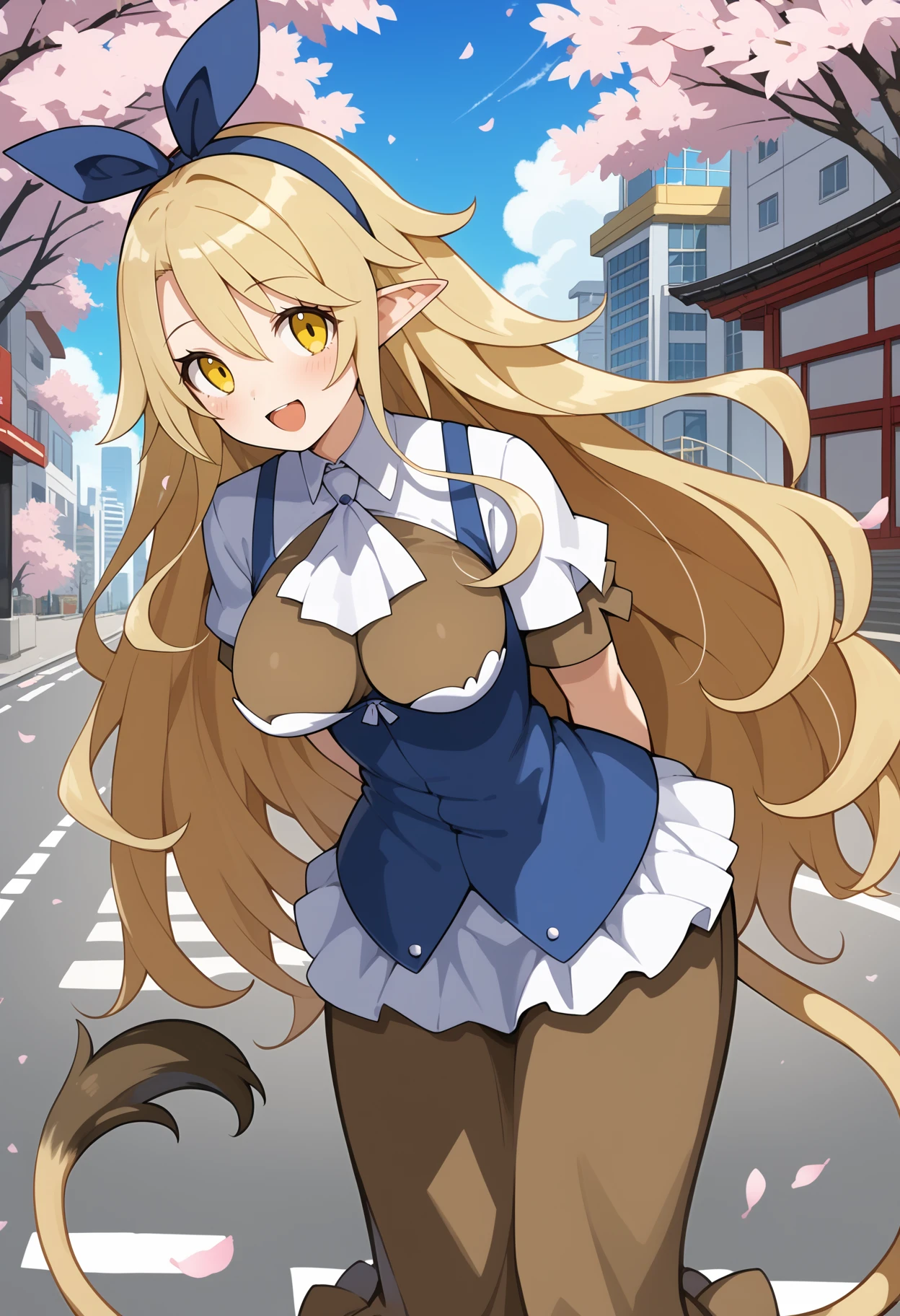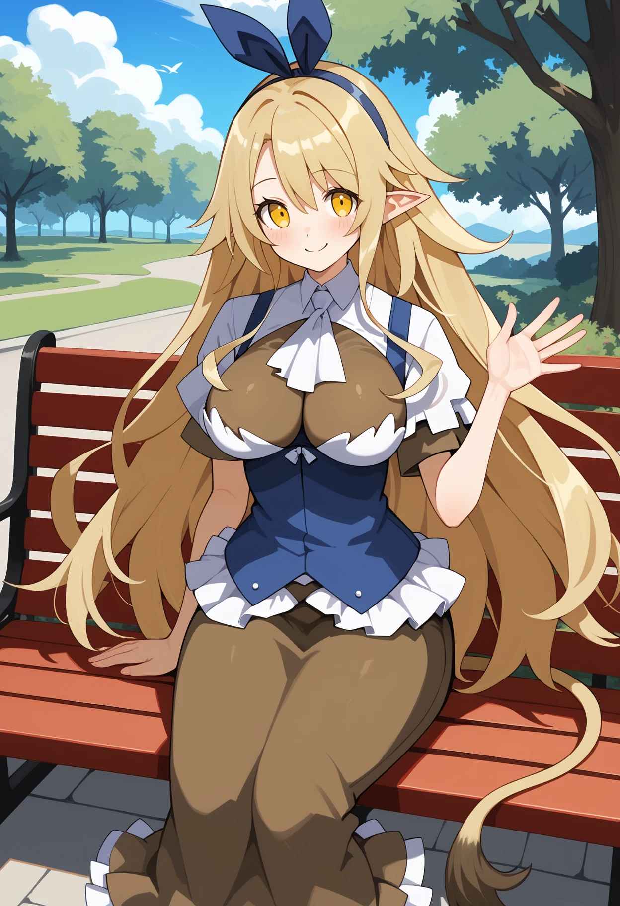 aalieze, long hair, blonde hair, hairband, hair ribbon, yellow eyes, pointy ears, large breasts, tail, white ascot, underbust, brown shirt, white shirt, blue vest, short sleeves, long skirt, brown skirt