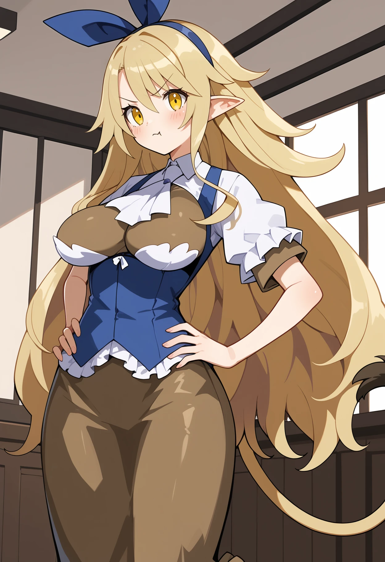 outfit1aalieze, long hair, blonde hair, hairband, hair ribbon, yellow eyes, pointy ears, large breasts, tail, white ascot, underbust, brown shirt, white shirt, blue vest, short sleeves, long skirt, brown skirt