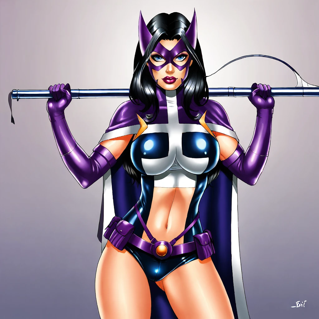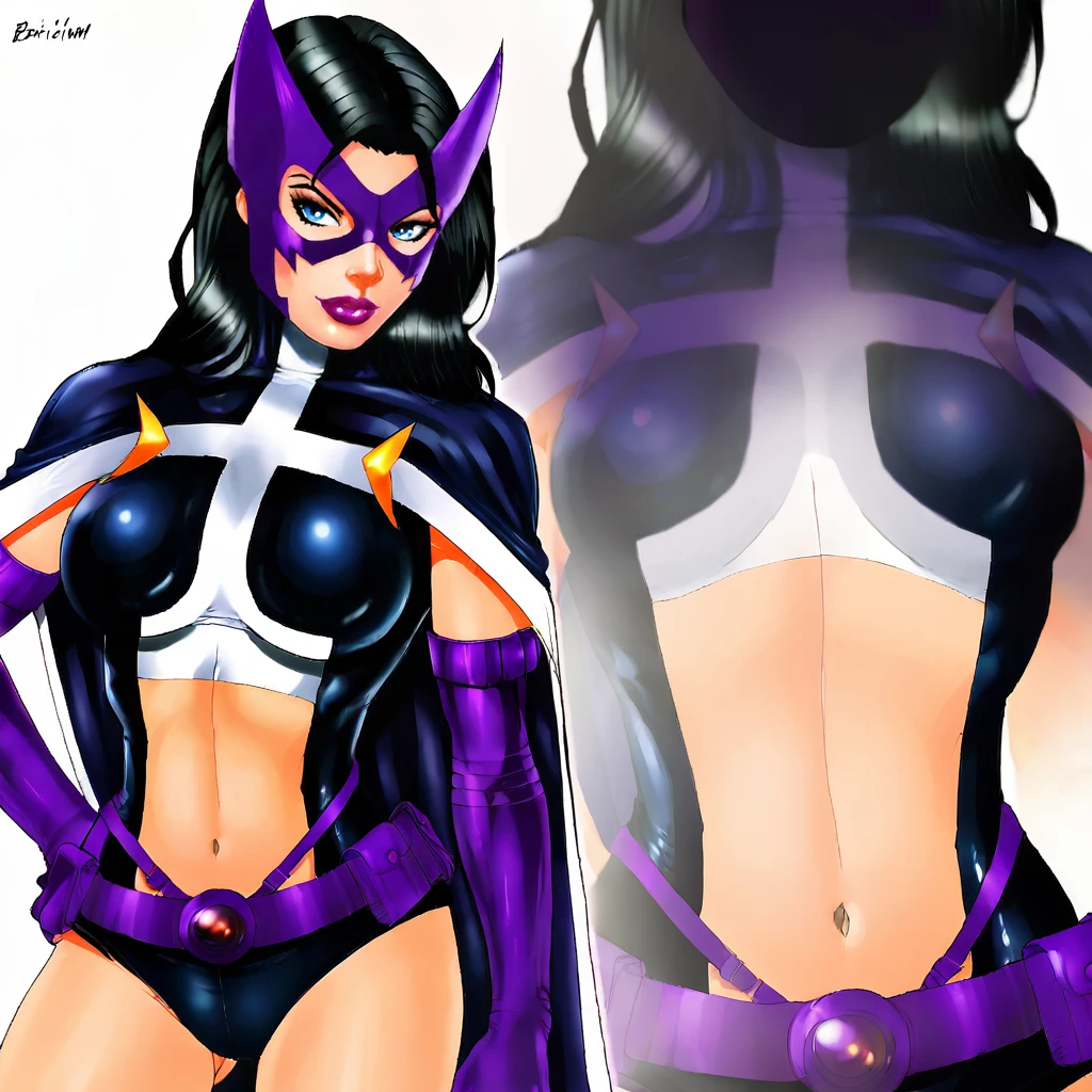 Trigger : huntressdccomics, 1girl, solo, black hair, superhero, large breasts, mask, utility belt, cape, long hair, elbow gloves, navel, midriff, blue eyes, purple gloves, lips, lipstick, makeup, belt pouch, crop top, leotard, giant breasts