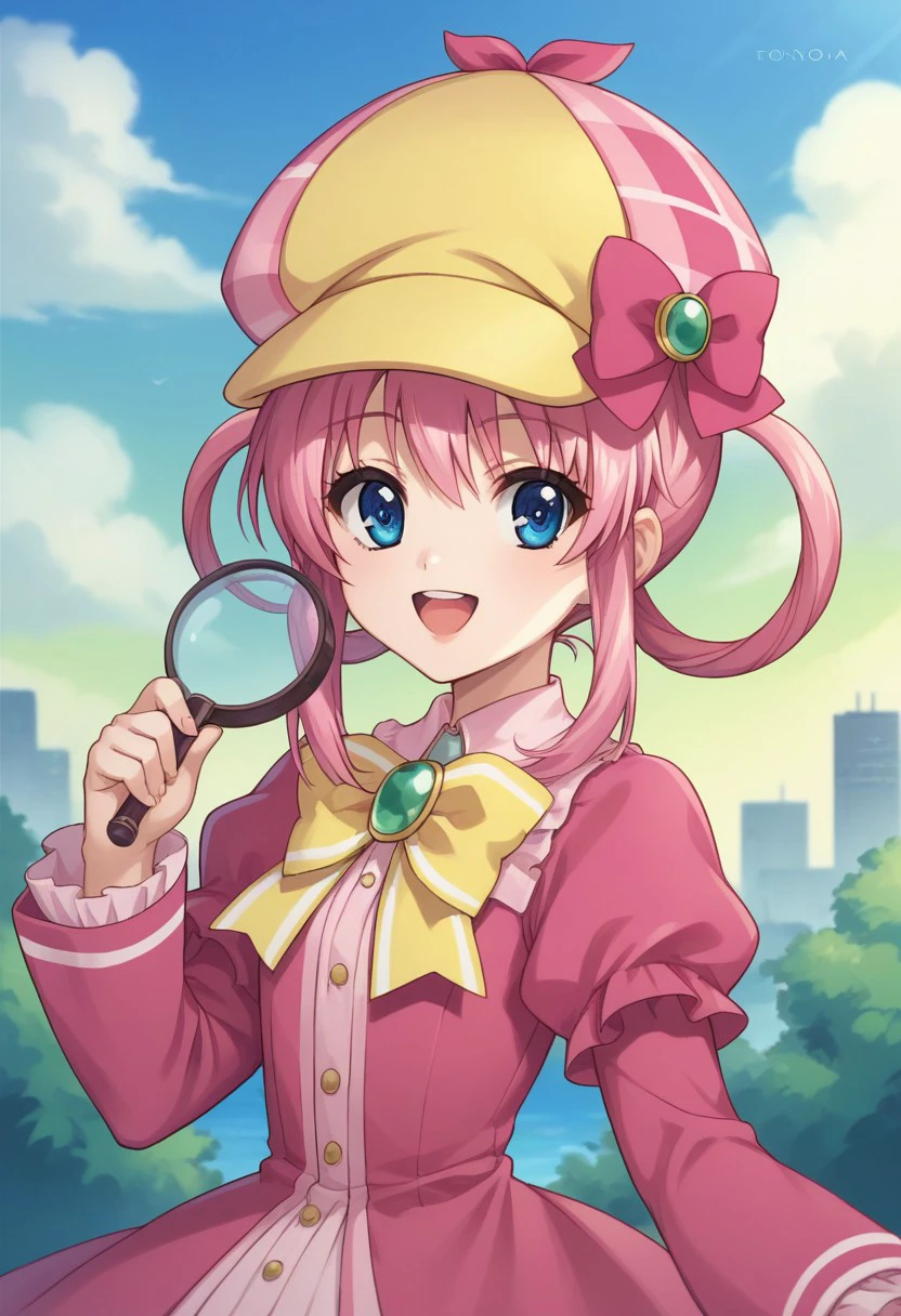 pink dress, bow, magnifying glass, sidelocks, detective.