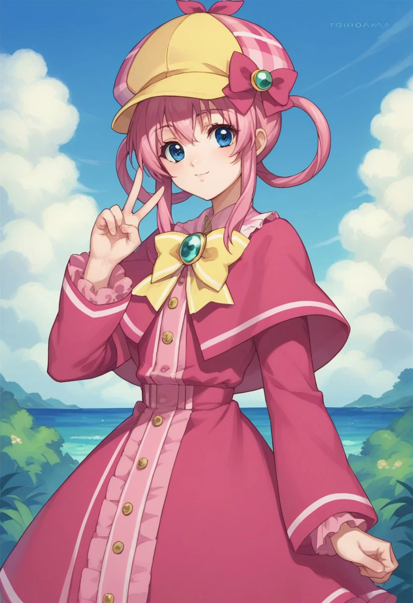 sherlockshellinford, 1girl, hair rings, pink hair, solo, blue eyes, hat, boots, deerstalker, dress,