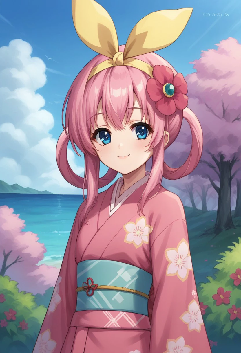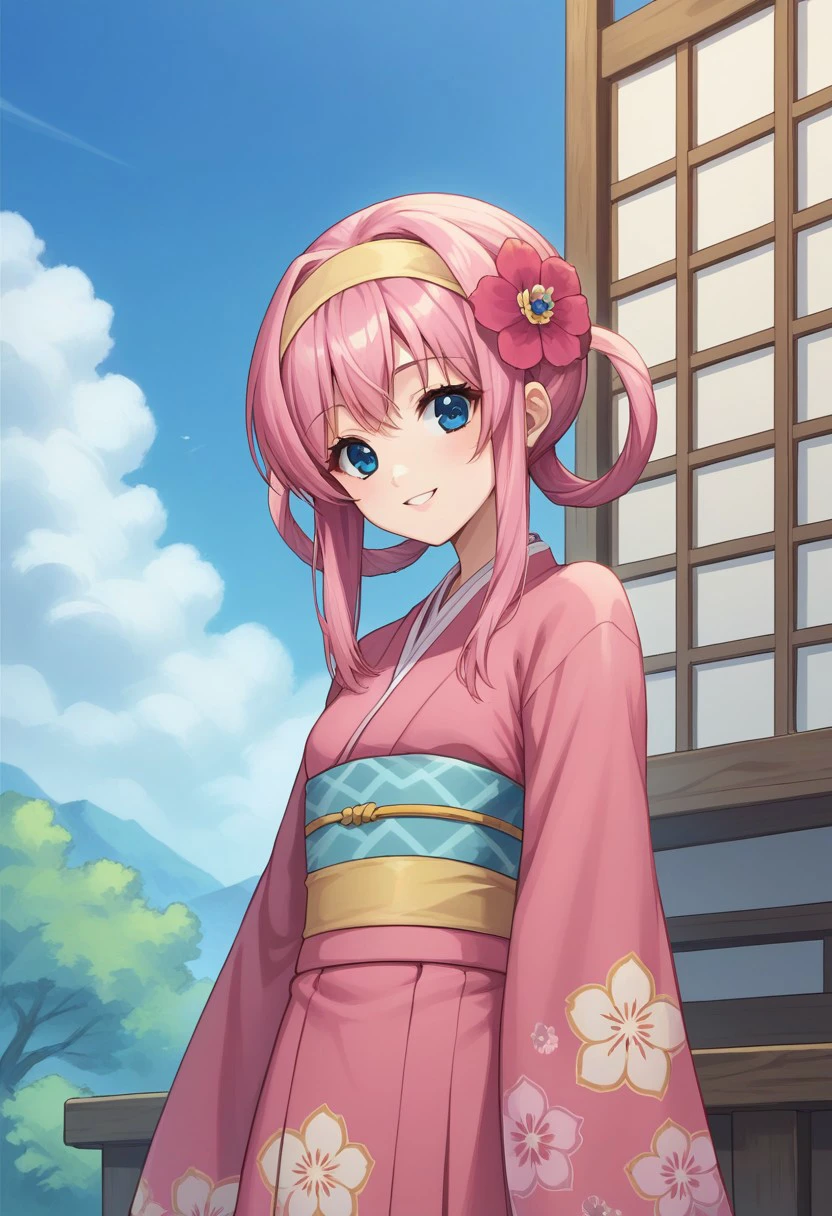 sherlockshellinford, 1girl, japanese clothes, pink hair, solo, kimono, blue eyes, pink kimono, sash, obi, floral print, hair ornament, wide sleeves, hairband, sandals, flower, tabi, hair rings, hair flower, sidelocks, long sleeves,