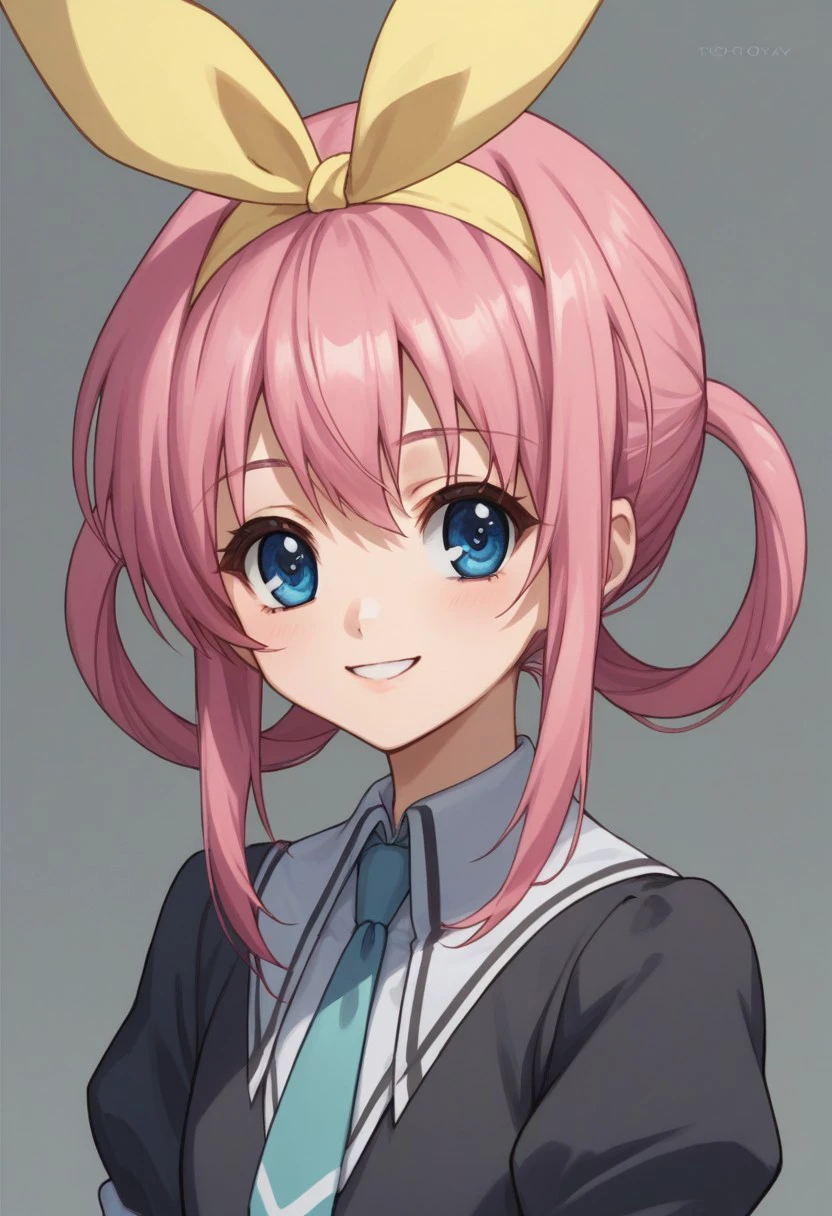 sherlockshellinford, 1girl, solo, blue eyes, pink hair, sidelocks, hairband, school uniform, necktie, blue necktie, hair rings,