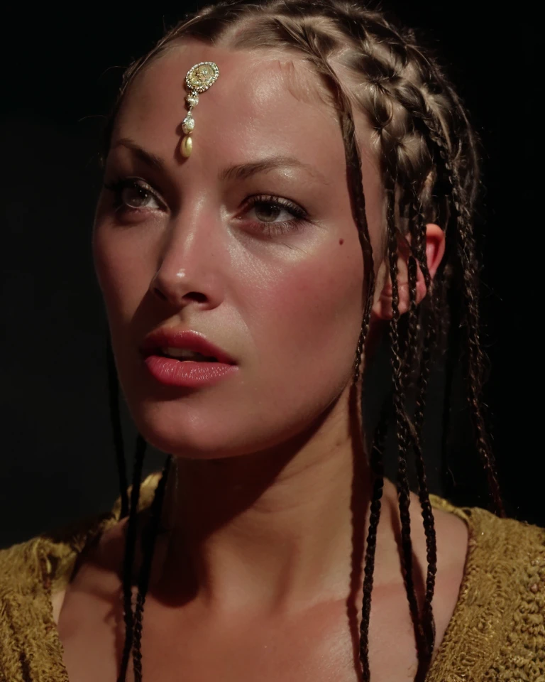 1girl, eot, pfarah, cost1, realistic, brunette, cornrow braids, side view, tanned skin, mascara, teardrop forehead pearl, portrait,