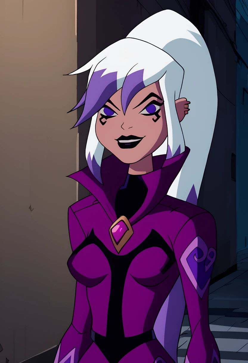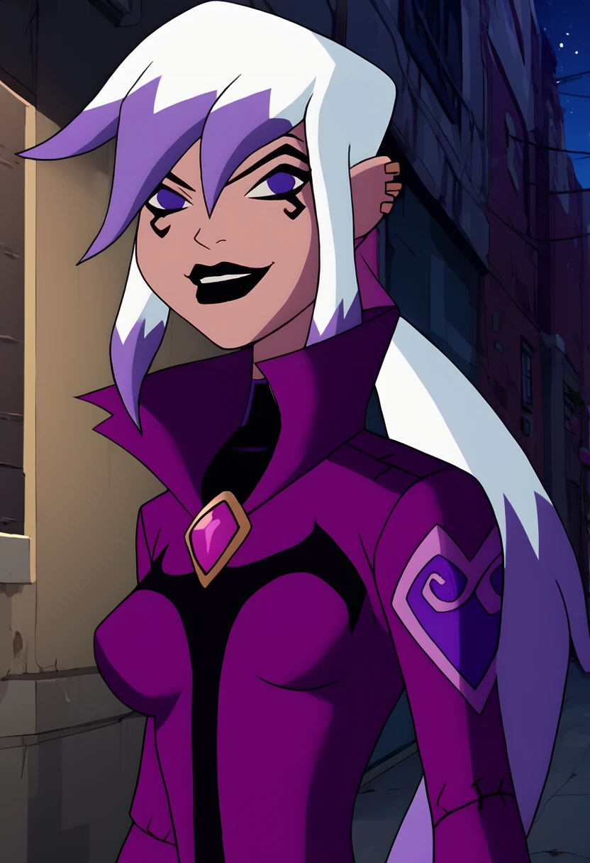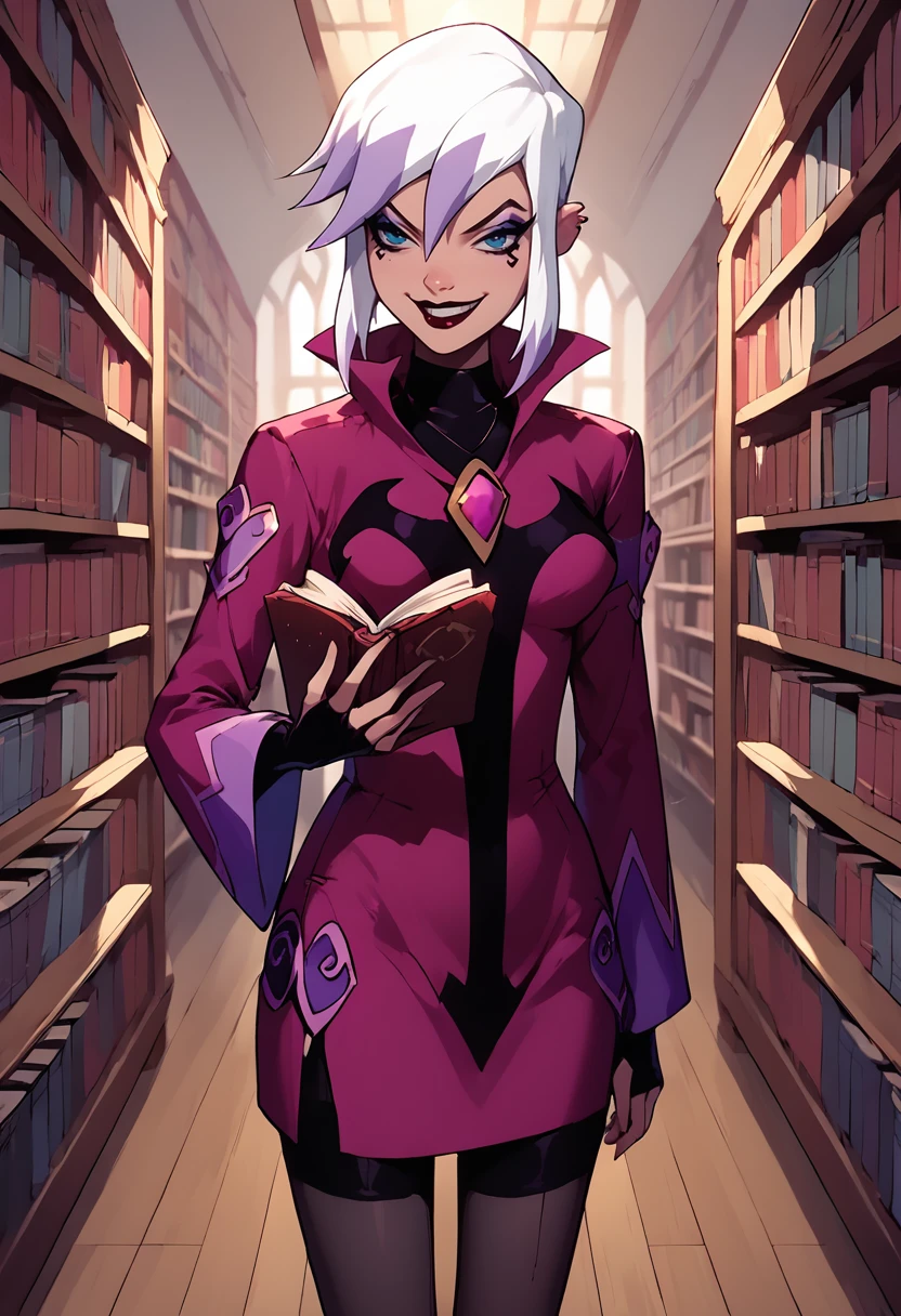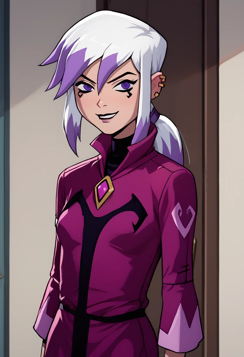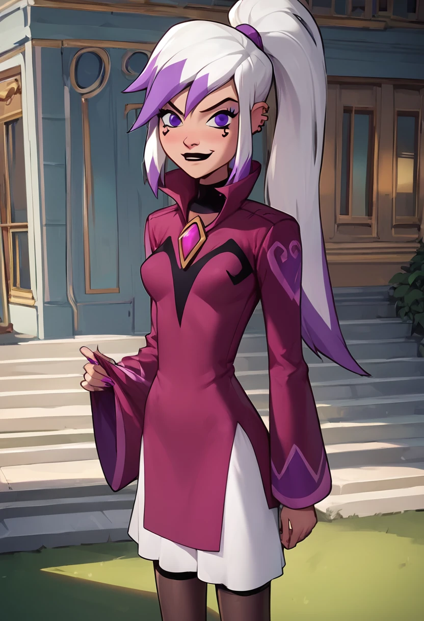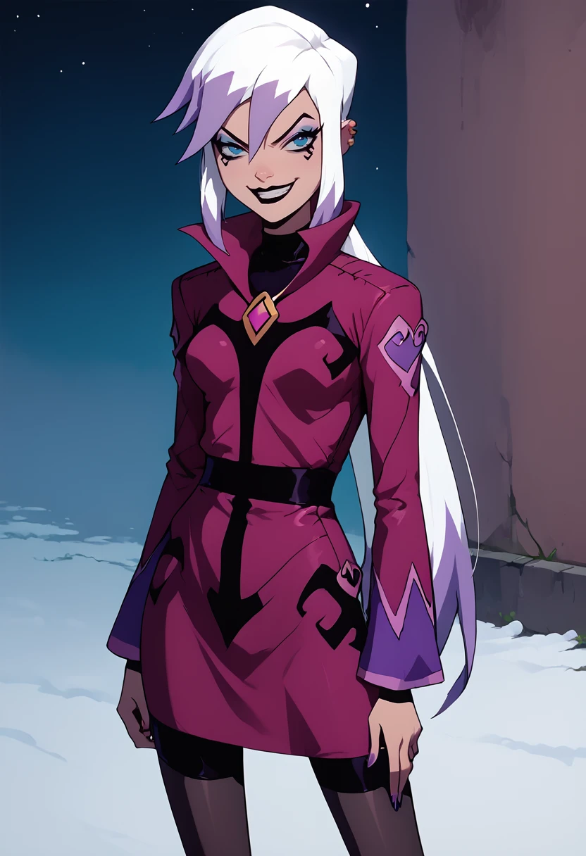 Trigger world: charmcaster, white hair, two-tone hair, makeup Outfit: Dress, skirt, black pantyhose,