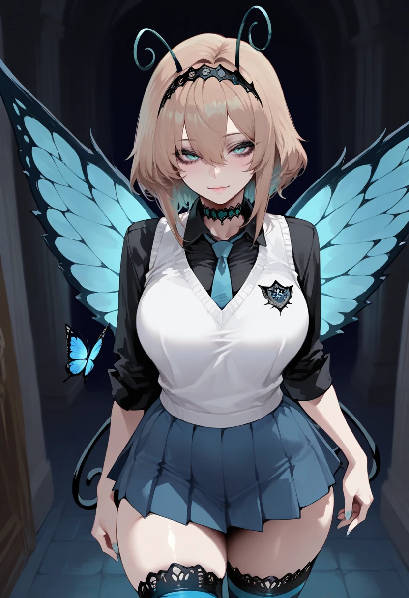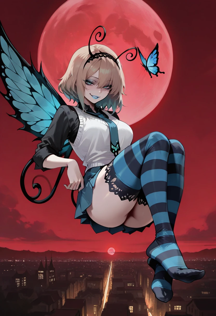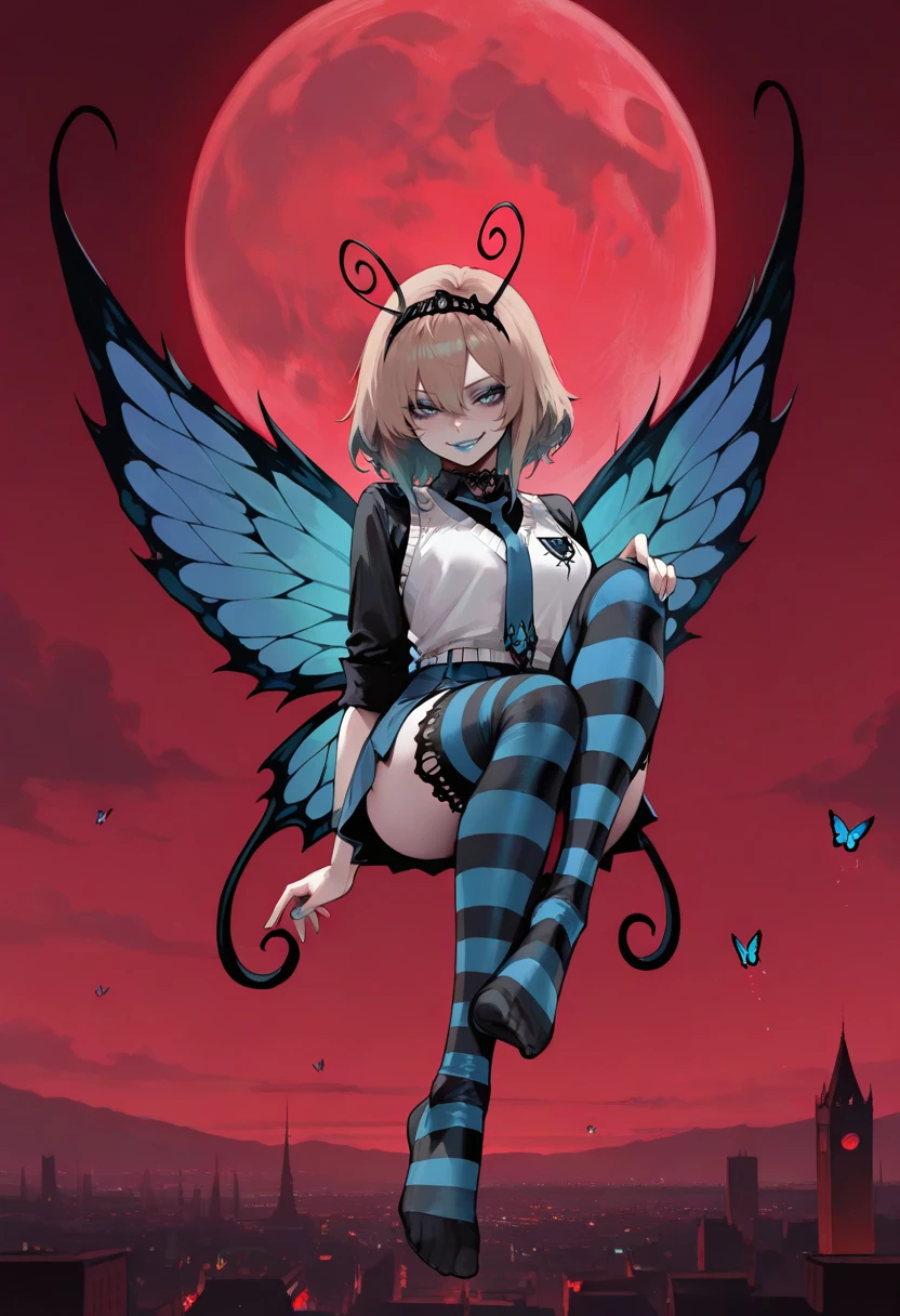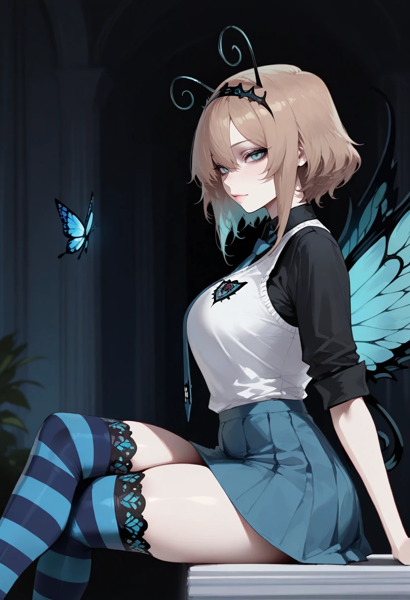 1girl, fairy, light brown hair, diadem, antennae, blue tie, white vest, black shirt, blue butterfly wings, striped black and blue stocking, blue skirt,